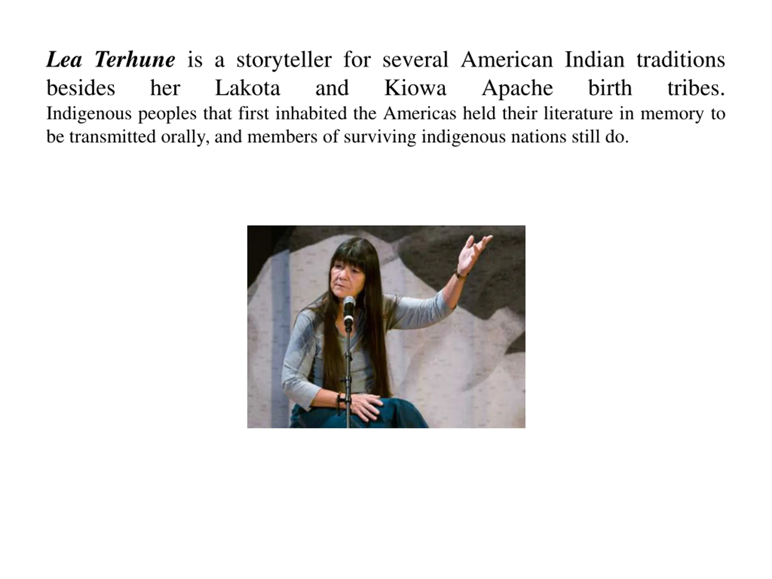 Lea Terhune is a storyteller for several American Indian traditions besides her Lakota and Kiowa Indigenous peoples that first inhabited the Americas held their literature in memory to be transmitted orally, and members of surviving indigenous nations still do. Apache birth tribes.