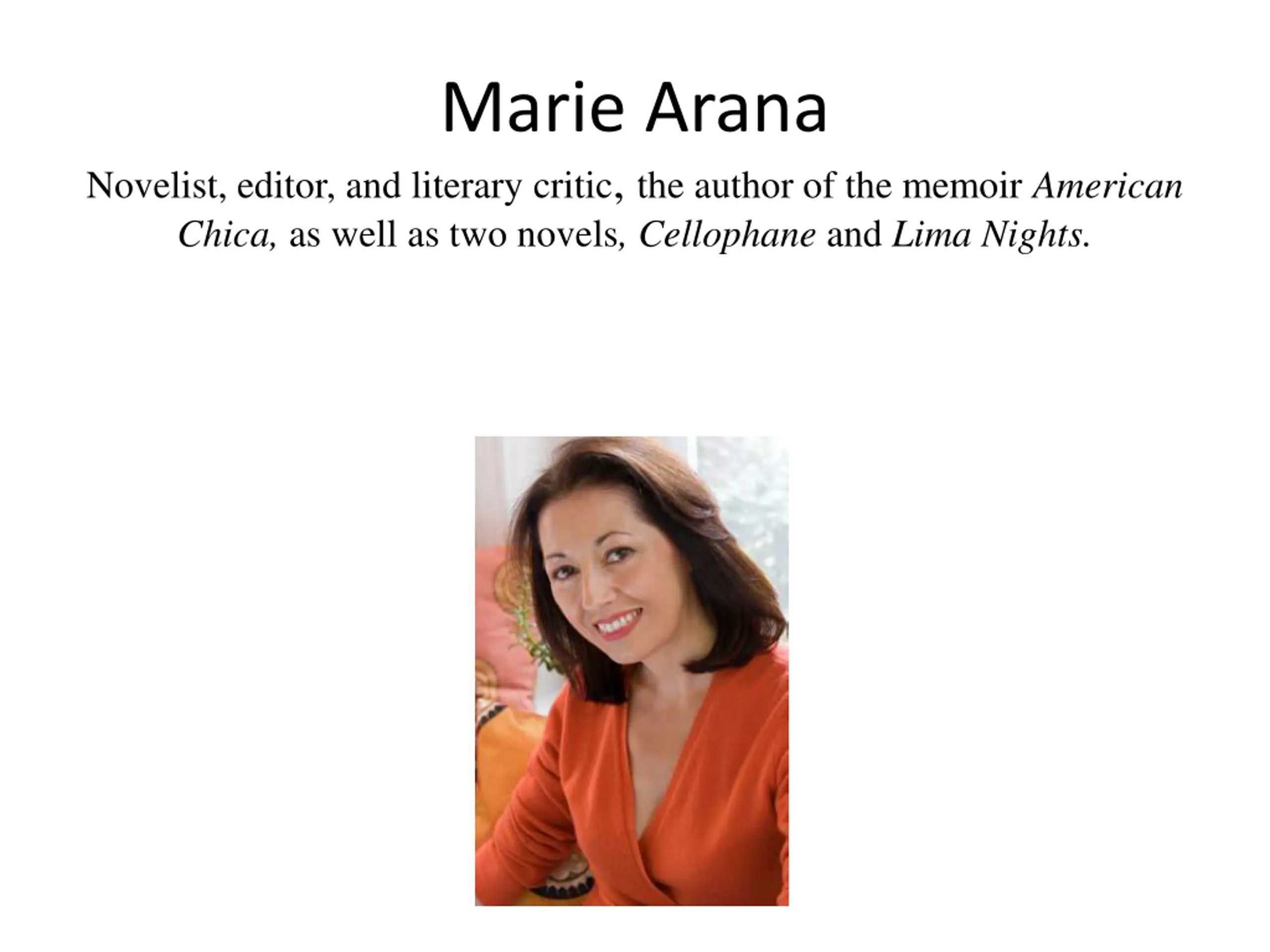 Marie Arana Novelist, editor, and literary critic, the author of the memoir American Chica, as well as two novels, Cellophane and Lima Nights.