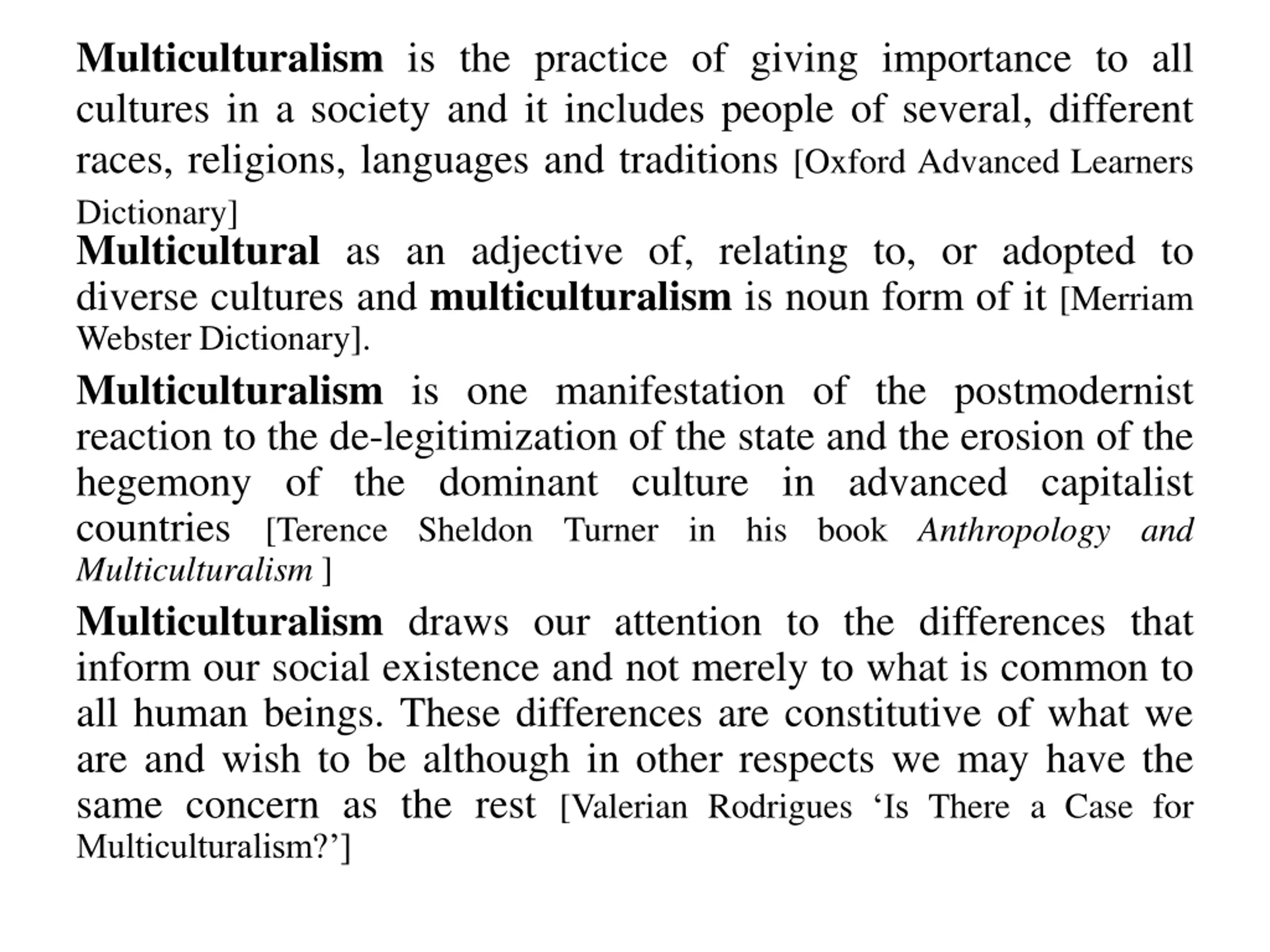 Multiculturalism is the practice of giving importance to all cultures in a society and it includes people of several, different races, religions, languages and traditions [Oxford Advanced Learners Dictionary] Multicultural as an adjective of, relating to, or adopted to diverse cultures and multiculturalism is noun form of it [Merriam Webster Dictionary]. Multiculturalism is one manifestation of the postmodernist reaction to the de-legitimization of the state and the erosion of the hegemony of the dominant culture in advanced capitalist countries [Terence Sheldon Turner in his book Anthropology and Multiculturalism ] Multiculturalism draws our attention to the differences that inform our social existence and not merely to what is common to all human beings. These differences are constitutive of what we are and wish to be although in other respects we may have the same concern as the rest [Valerian Rodrigues Is There a Case for Multiculturalism? ]