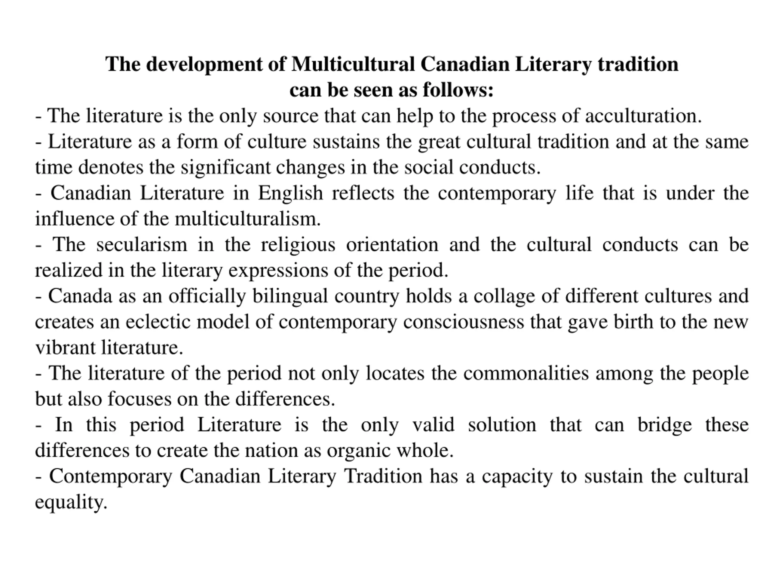 The development of Multicultural Canadian Literary tradition can be seen as follows: - The literature is the only source that can help to the process of acculturation. - Literature as a form of culture sustains the great cultural tradition and at the same time denotes the significant changes in the social conducts. - Canadian Literature in English reflects the contemporary life that is under the influence of the multiculturalism. - The secularism in the religious orientation and the cultural conducts can be realized in the literary expressions of the period. - Canada as an officially bilingual country holds a collage of different cultures and creates an eclectic model of contemporary consciousness that gave birth to the new vibrant literature. - The literature of the period not only locates the commonalities among the people but also focuses on the differences. - In this period Literature is the only valid solution that can bridge these differences to create the nation as organic whole. - Contemporary Canadian Literary Tradition has a capacity to sustain the cultural equality.