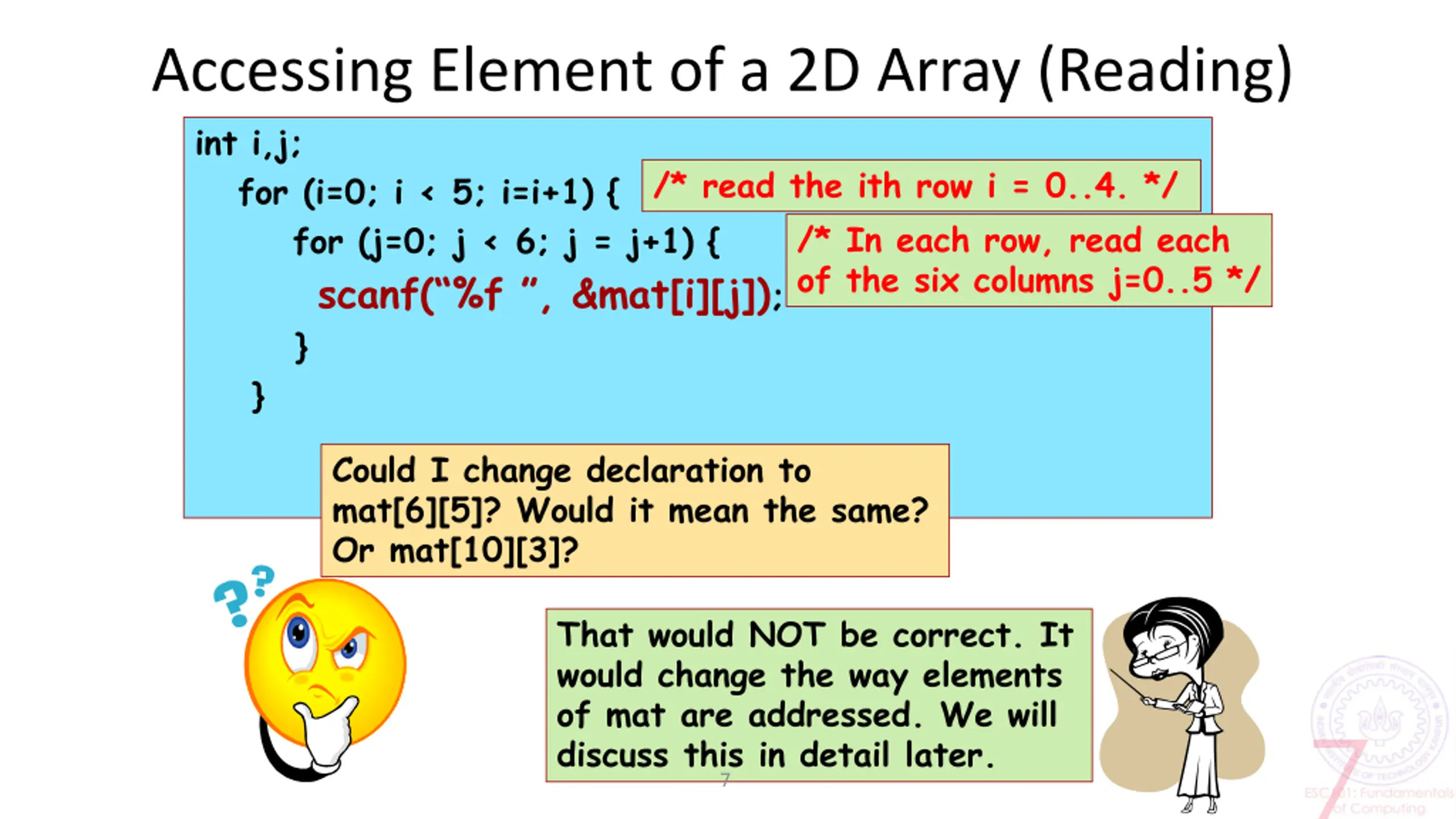 Accessing Element of a 2D Array (Reading) Code for reading the matrix mat[5][6] from the terminal. The address of the i,j th matrix element is &mat[i][j]. This works without parentheses since the array indexing operator [] has higher precedence than &. int i,j; for (i=0; i < 5; i=i+1) { for (j=0; j < 6; j = j+1) { } } So it really doesn t matter whether the entire input is given in 5 rows of 6 doubles in a row or all 30 doubles in a single line, etc.. /* read the ith row i = 0..4. */ /* In each row, read each of the six columns j=0..5 */ scanf( %f , &mat[i][j]); scanf with %f option will skip over whitespace.