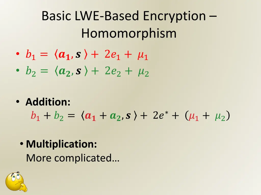Basic LWE-Based Encryption Homomorphism ?1= ??,? + 2?1+ ?1 ?2= ??,? + 2?2+ ?2 Addition: ?1+ ?2= ??+ ??,? + 2? + ?1+ ?2 Multiplication: More complicated