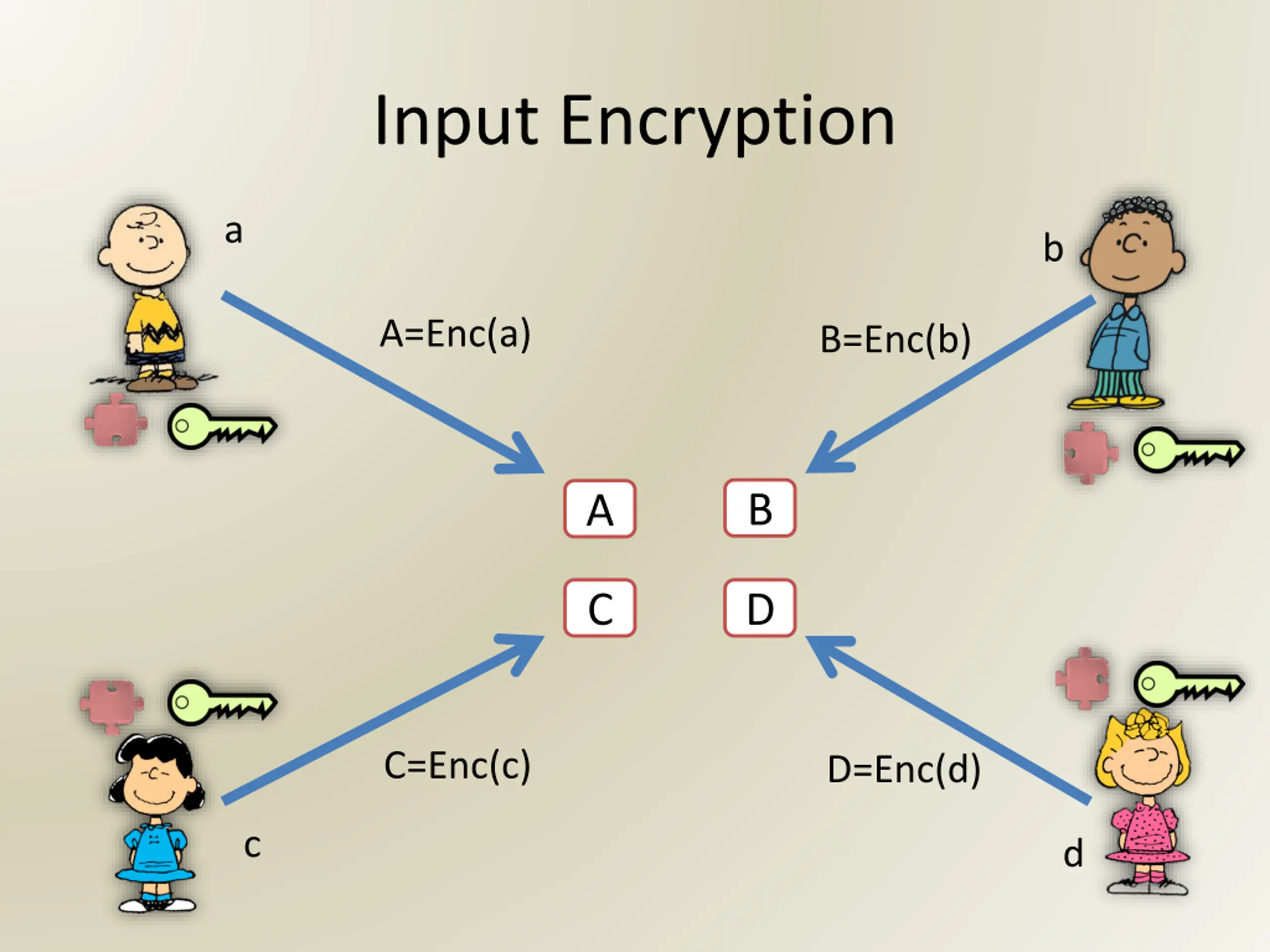 Input Encryption a b A=Enc(a) B=Enc(b) B A C D C=Enc(c) D=Enc(d) c d