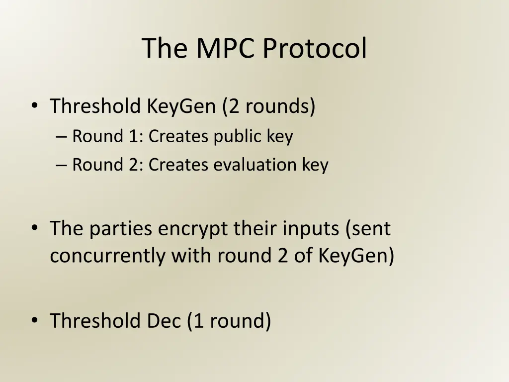 The MPC Protocol Threshold KeyGen (2 rounds) Round 1: Creates public key Round 2: Creates evaluation key The parties encrypt their inputs (sent concurrently with round 2 of KeyGen) Threshold Dec (1 round)