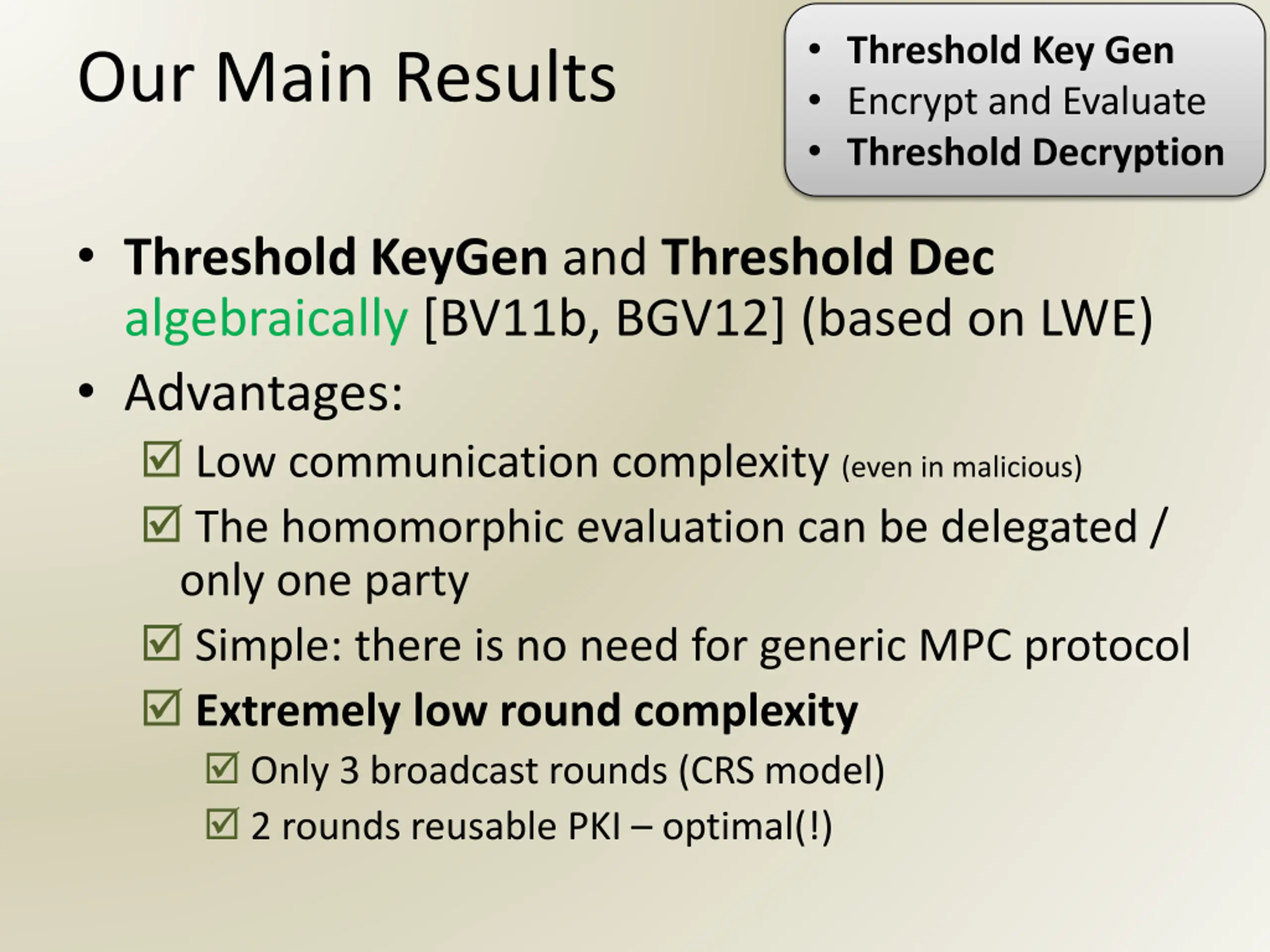 Threshold Key Gen Encrypt and Evaluate Threshold Decryption Our Main Results Threshold KeyGen and Threshold Dec algebraically [BV11b, BGV12] (based on LWE) Advantages: Low communication complexity (even in malicious) The homomorphic evaluation can be delegated / only one party Simple: there is no need for generic MPC protocol Extremely low round complexity Only 3 broadcast rounds (CRS model) 2 rounds reusable PKI optimal(!)