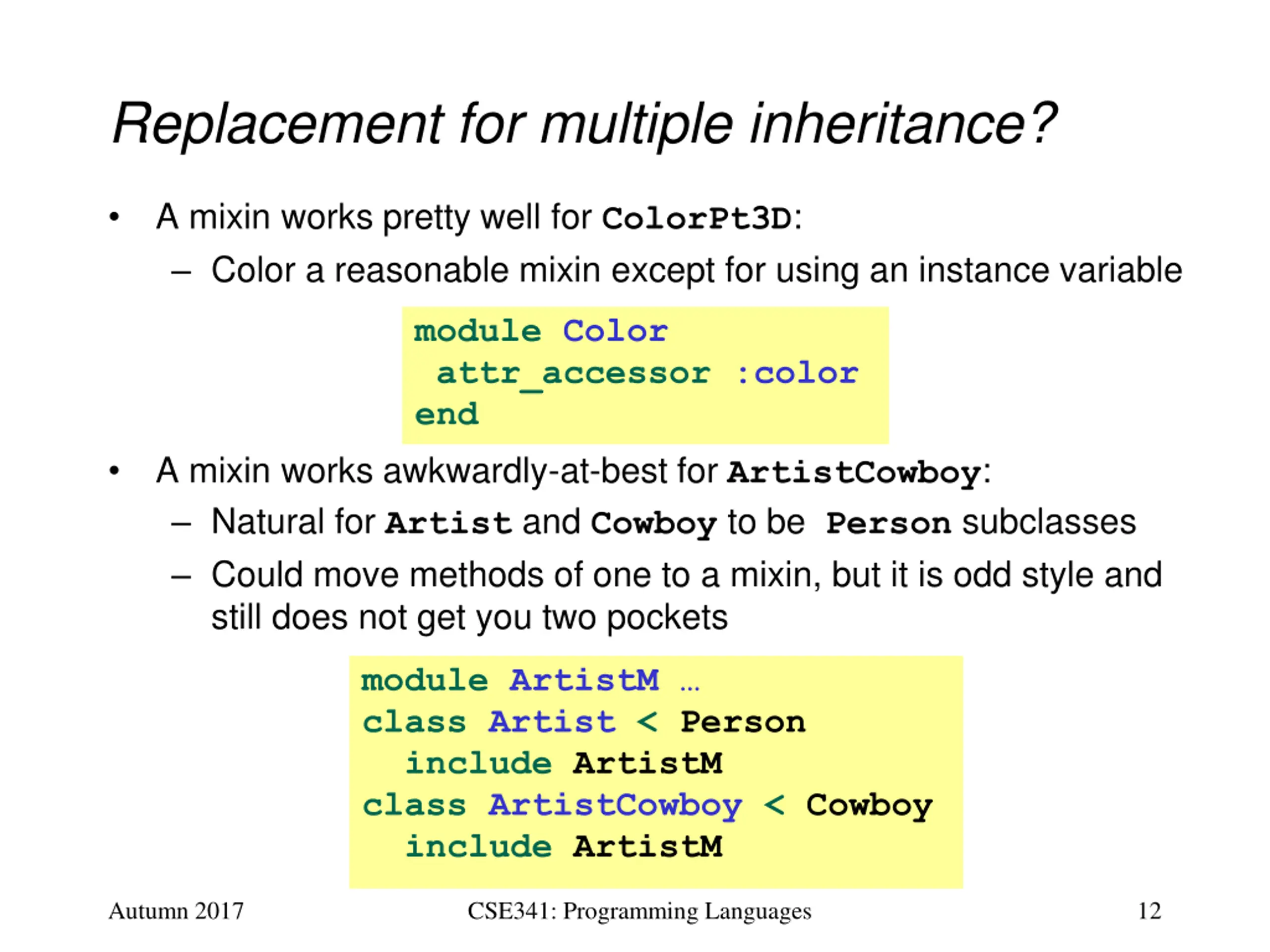 Replacement for multiple inheritance? A mixin works pretty well for ColorPt3D: Color a reasonable mixin except for using an instance variable module Color attr_accessor :color end A mixin works awkwardly-at-best for ArtistCowboy: Natural for Artist and Cowboy to be Person subclasses Could move methods of one to a mixin, but it is odd style and still does not get you two pockets module ArtistM class Artist < Person include ArtistM class ArtistCowboy < Cowboy include ArtistM Autumn 2017 CSE341: Programming Languages 12