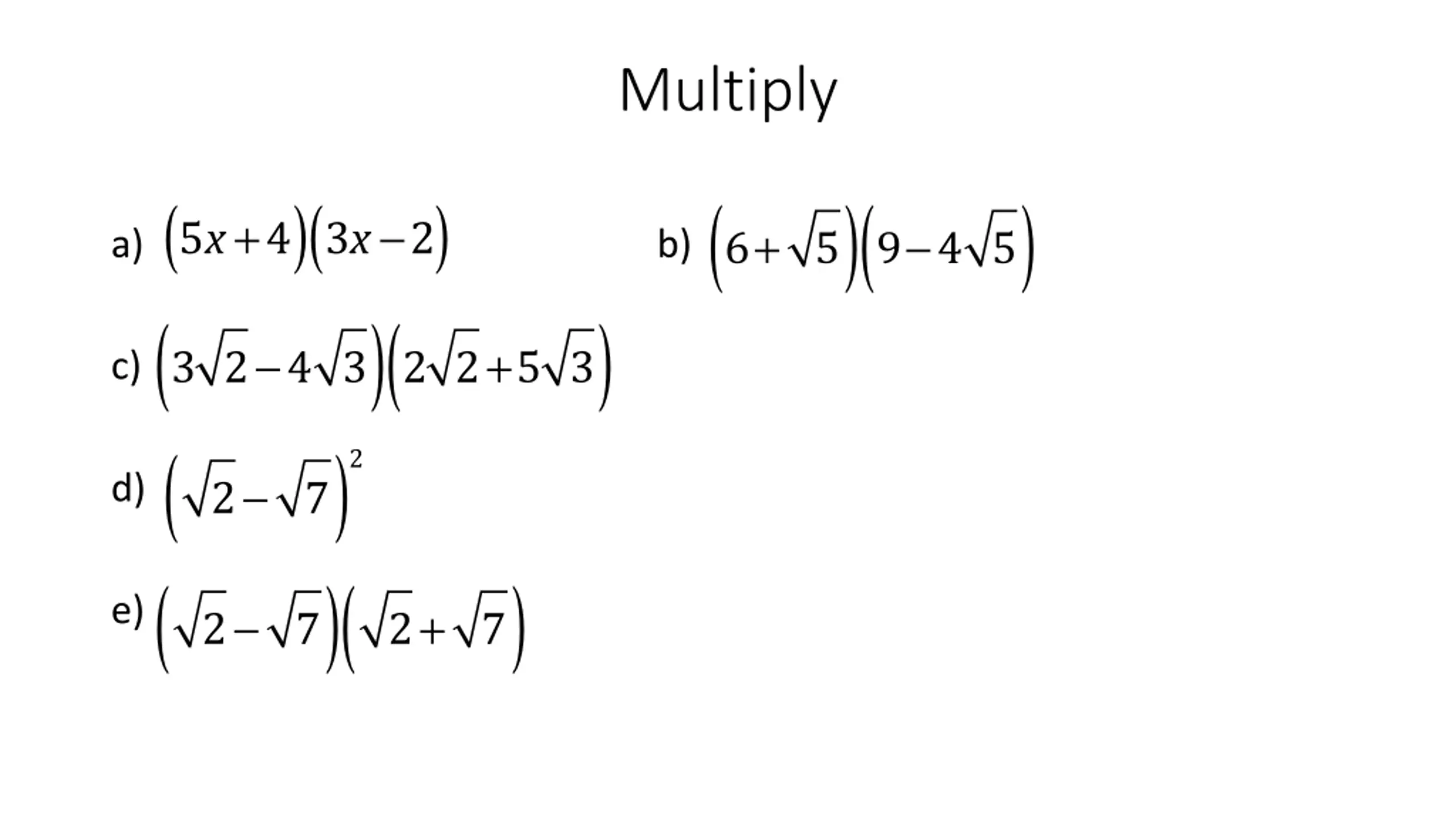 Multiply ( )9-4 5 ( ) 5x+4 ( ( ( )3x-2 ( ) 6+ 5 a) b) )2 2+5 3 ( ) 3 2-4 3 c) ) ( 2 2- 7 d) e) ( ) ) 2- 7 2+ 7