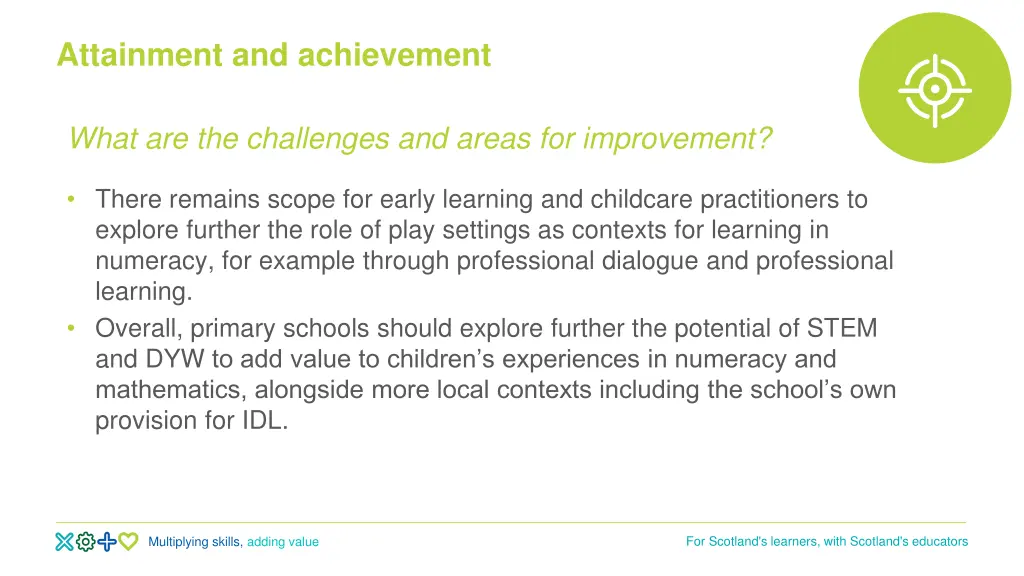 Attainment and achievement What are the challenges and areas for improvement? There remains scope for early learning and childcare practitioners to explore further the role of play settings as contexts for learning in numeracy, for example through professional dialogue and professional learning. Overall, primary schools should explore further the potential of STEM and DYW to add value to children s experiences in numeracy and mathematics, alongside more local contexts including the school s own provision for IDL. For Scotland's learners, with Scotland's educators Multiplying skills, adding value