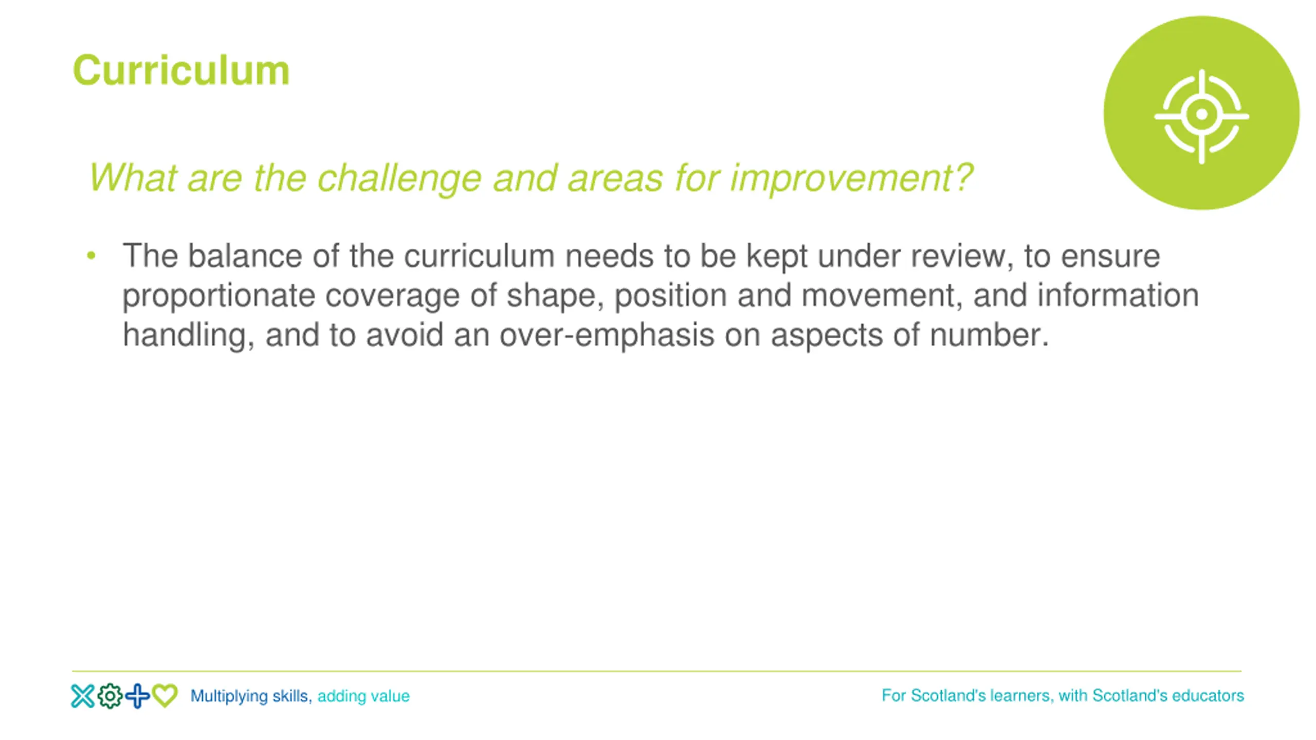 Curriculum What are the challenge and areas for improvement? The balance of the curriculum needs to be kept under review, to ensure proportionate coverage of shape, position and movement, and information handling, and to avoid an over-emphasis on aspects of number. For Scotland's learners, with Scotland's educators Multiplying skills, adding value