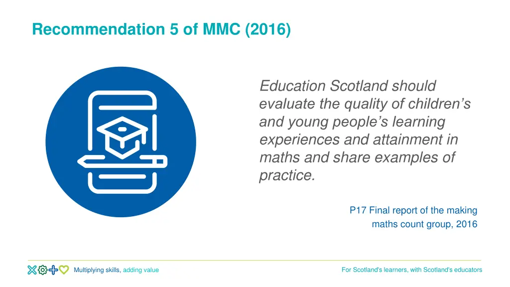 Recommendation 5 of MMC (2016) Education Scotland should evaluate the quality of children s and young people s learning experiences and attainment in maths and share examples of practice. P17 Final report of the making maths count group, 2016 For Scotland's learners, with Scotland's educators Multiplying skills, adding value