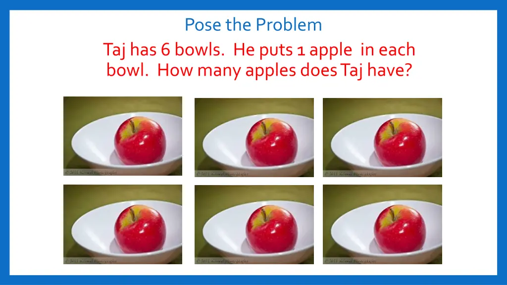 Pose the Problem Taj has 6 bowls. He puts 1 apple in each bowl. How many apples does Taj have? does he use?