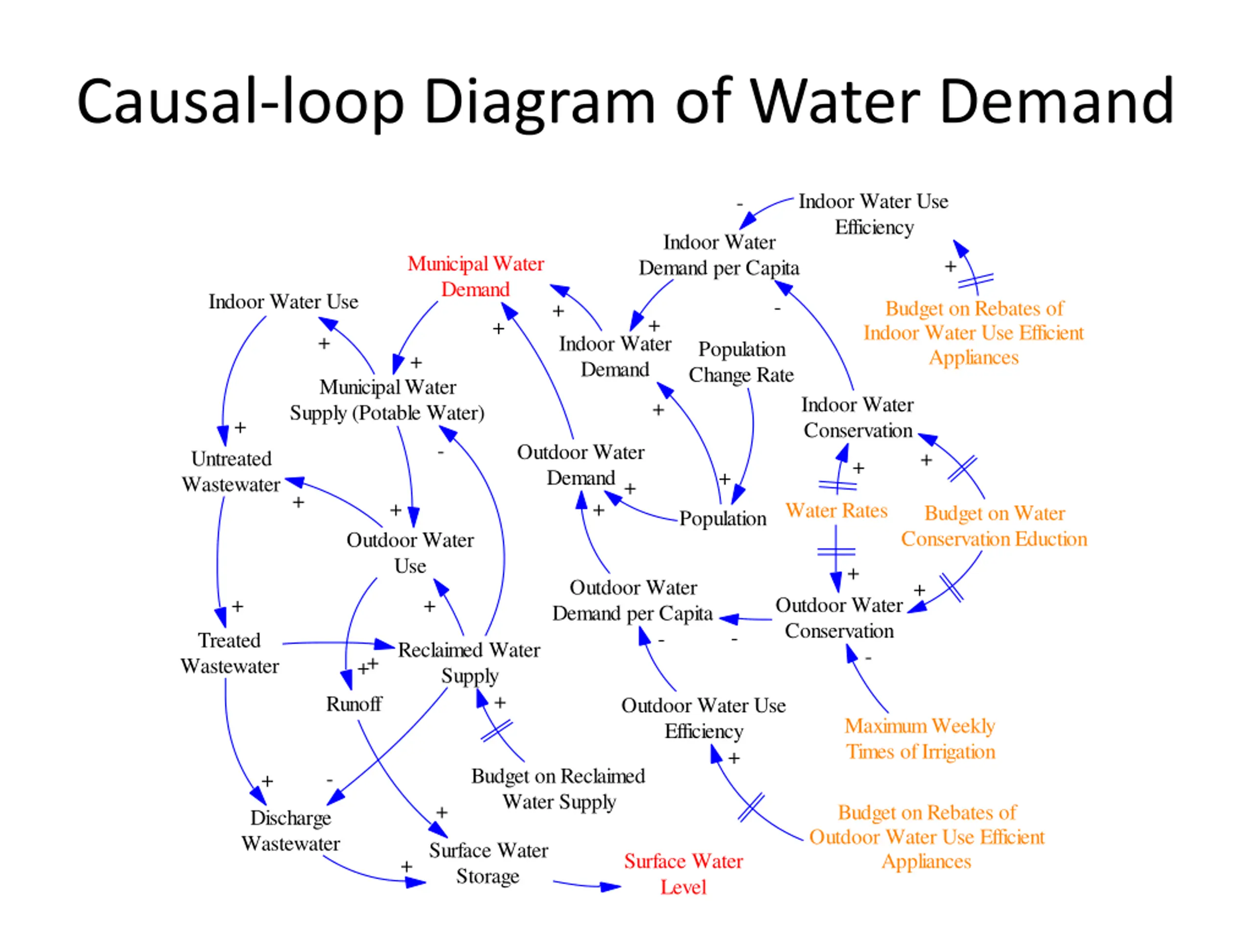 Causal-loop Diagram of Water Demand Indoor Water Use Efficiency - Indoor Water Demand per Capita Municipal Water Demand + Indoor Water Use - Budget on Rebates of Indoor Water Use Efficient Appliances + + + + Indoor Water Demand Population Change Rate + Municipal Water Supply (Potable Water) Indoor Water Conservation + + - Outdoor Water Demand Untreated Wastewater + + + + + + + Water Rates Budget on Water Conservation Eduction Population Outdoor Water Use + Outdoor Water Demand per Capita + + + Outdoor Water Conservation - - Treated Wastewater Reclaimed Water Supply - + + + Runoff Outdoor Water Use Efficiency Maximum Weekly Times of Irrigation + Budget on Reclaimed Water Supply - + + Budget on Rebates of Outdoor Water Use Efficient Appliances Discharge Wastewater Surface Water Storage Surface Water Level +