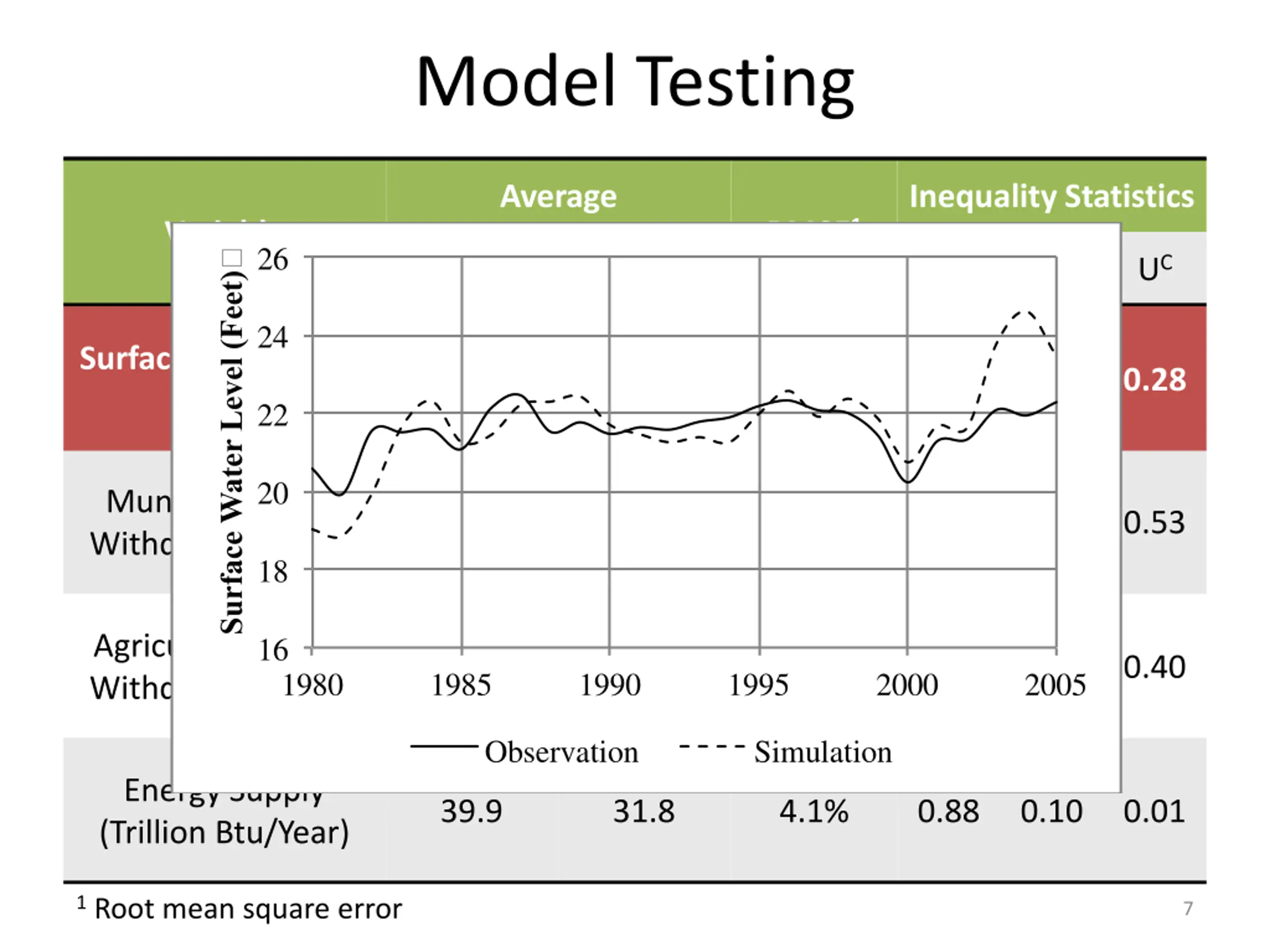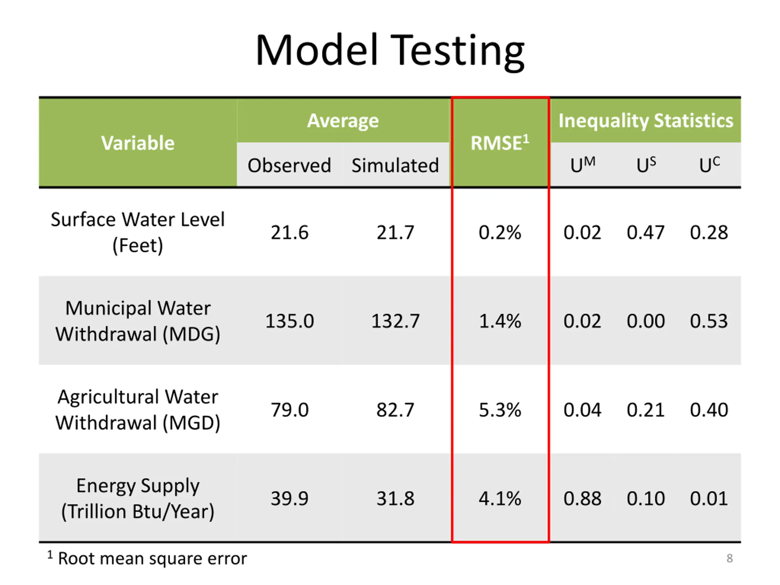 Model Testing Average Inequality Statistics RMSE1 Variable UM US UC Observed Simulated Surface Water Level (Feet) 21.6 21.7 0.2% 0.02 0.47 0.28 Municipal Water Withdrawal (MDG) 135.0 132.7 1.4% 0.02 0.00 0.53 Agricultural Water Withdrawal (MGD) 79.0 82.7 5.3% 0.04 0.21 0.40 Energy Supply (Trillion Btu/Year) 39.9 31.8 4.1% 0.88 0.10 0.01 1Root mean square error 8