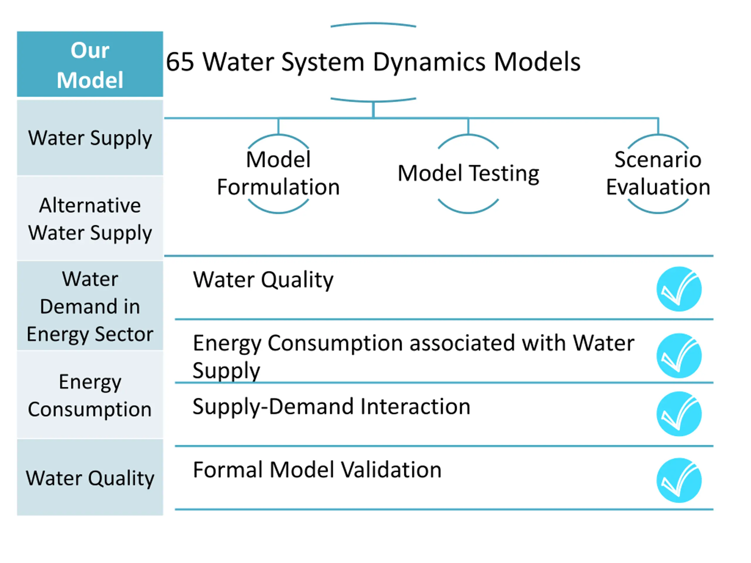 Our Model 65 Water System Dynamics Models Water Supply Problem Articulation Alternative Water Supply Model Formulation Scenario Evaluation Model Testing Research Gaps Demand in Energy Sector Water Quality Water Energy Consumption associated with Water Supply Supply-Demand Interaction Energy Consumption Formal Model Validation Water Quality