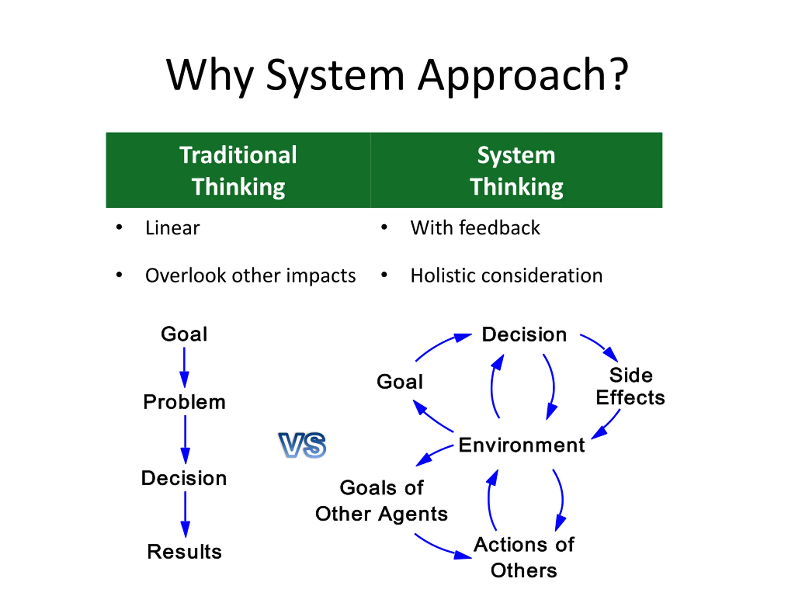 Why System Approach? Traditional Thinking System Thinking Linear With feedback Overlook other impacts Holistic consideration Goal Goal Decision Decision Side Side Effects Effects Goal Goal Problem Problem VS VS Environment Environment Decision Decision Goals of Goals of Other Agents Other Agents Actions of Actions of Others Others Results Results