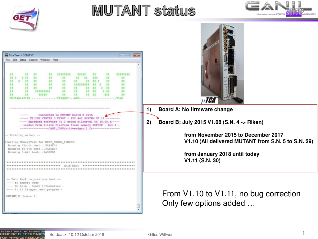 MUTANT status 1) Board A: No firmware change 2) Board B: July 2015 V1.08 (S.N. 4 -> Riken) from November 2015 to December 2017 V1.10 (All delivered MUTANT from S.N. 5 to S.N. 29) from January 2018 until today V1.11 (S.N. 30) From V1.10 to V1.11, no bug correction Only few options added 1 Bordeaux, 10-12 October 2018 Gilles Wittwer
