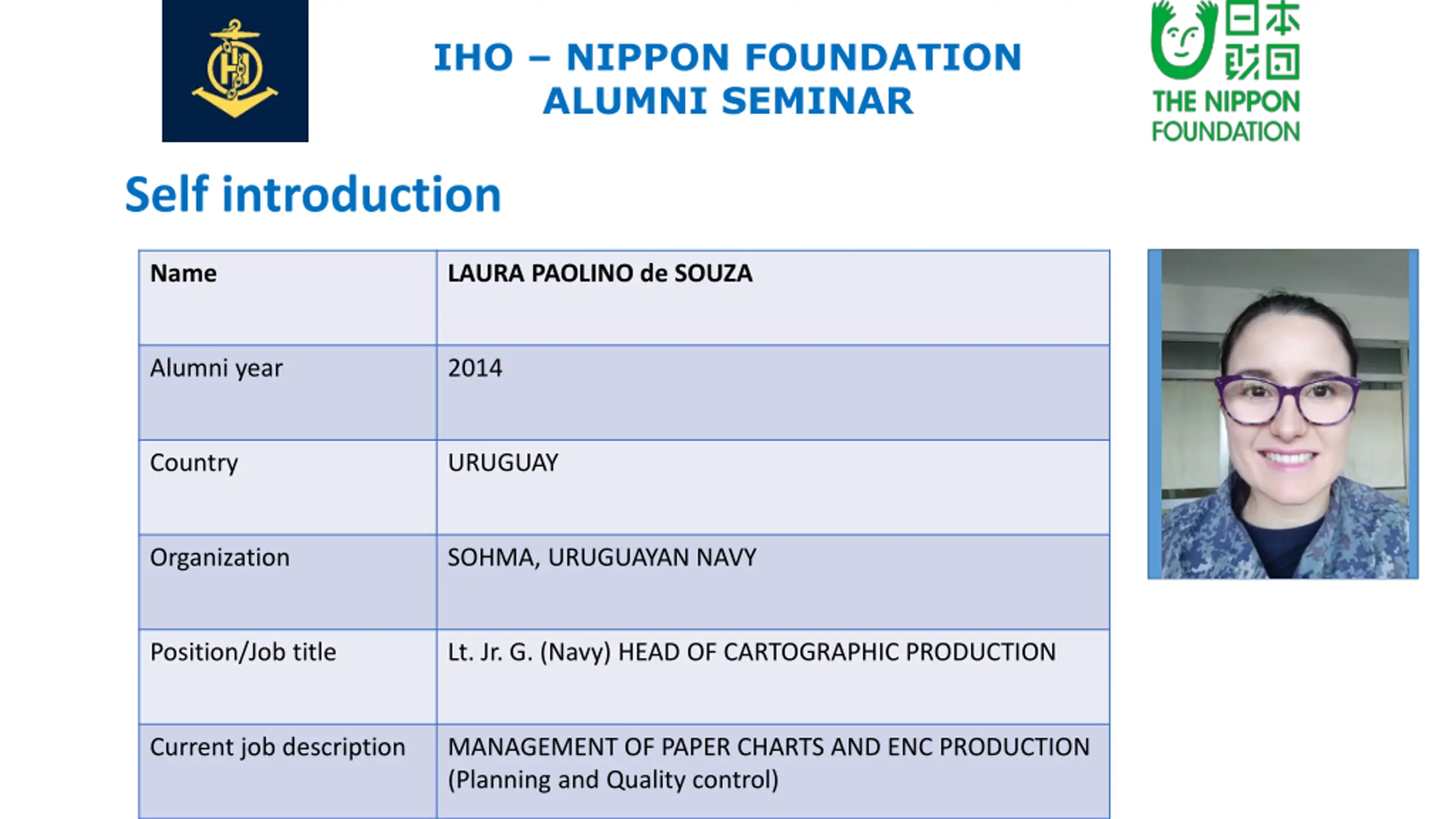IHO NIPPON FOUNDATION ALUMNI SEMINAR Self introduction Name LAURA PAOLINO de SOUZA Alumni year 2014 Please put your photo here! Country URUGUAY Organization SOHMA, URUGUAYAN NAVY Position/Job title Lt. Jr. G. (Navy) HEAD OF CARTOGRAPHIC PRODUCTION Current job description MANAGEMENT OF PAPER CHARTS AND ENC PRODUCTION (Planning and Quality control)