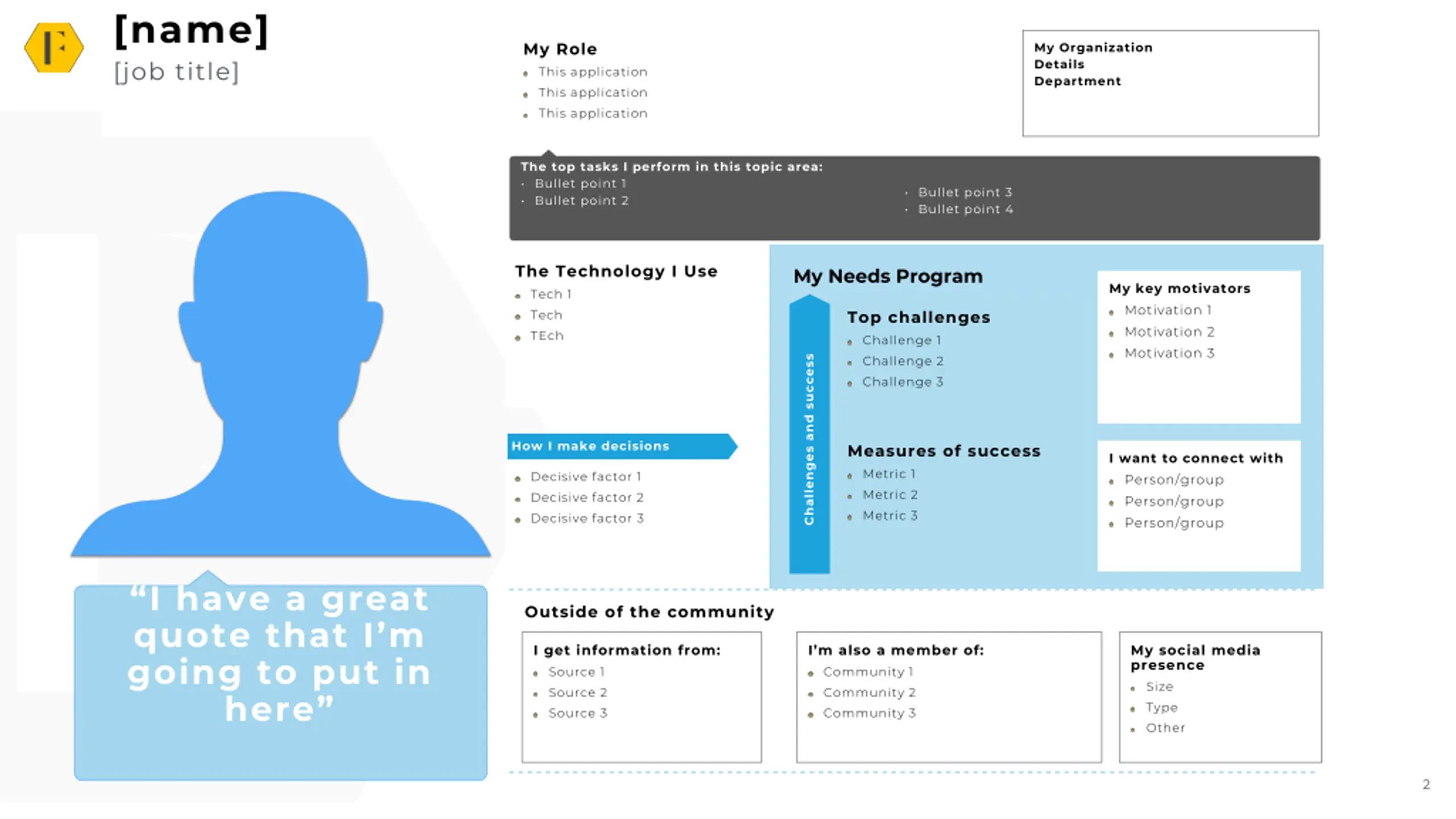 [name] [job title] My Role This application This application This application My Organization Details Department The top tasks I perform in this topic area: Bullet point 1 Bullet point 2 Top info Sec Tasks: Bullet point 3 Bullet point 4 The Technology I Use Tech 1 Tech TEch My Needs Program My key motivators Motivation 1 Motivation 2 Motivation 3 Top challenges Challenge 1 Challenge 2 Challenge 3 Challenges and success How I make decisions Measures of success Metric 1 Metric 2 Metric 3 I want to connect with Person/group Person/group Person/group Decisive factor 1 Decisive factor 2 Decisive factor 3 I have a great quote that I m going to put in here Outside of the community I get information from: Source 1 Source 2 Source 3 I m also a member of: Community 1 Community 2 Community 3 My social media presence Size Type Other 2