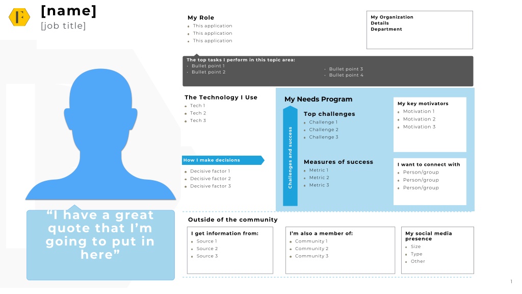 [name] [job title] My Role This application This application This application My Organization Details Department The top tasks I perform in this topic area: Bullet point 1 Bullet point 2 Top info Sec Tasks: Bullet point 3 Bullet point 4 The Technology I Use Tech 1 Tech TEch My Needs Program My key motivators Motivation 1 Motivation 2 Motivation 3 Top challenges Challenge 1 Challenge 2 Challenge 3 Challenges and success How I make decisions Measures of success Metric 1 Metric 2 Metric 3 I want to connect with Person/group Person/group Person/group Decisive factor 1 Decisive factor 2 Decisive factor 3 I have a great quote that I m going to put in here Outside of the community I get information from: Source 1 Source 2 Source 3 I m also a member of: Community 1 Community 2 Community 3 My social media presence Size Type Other 4