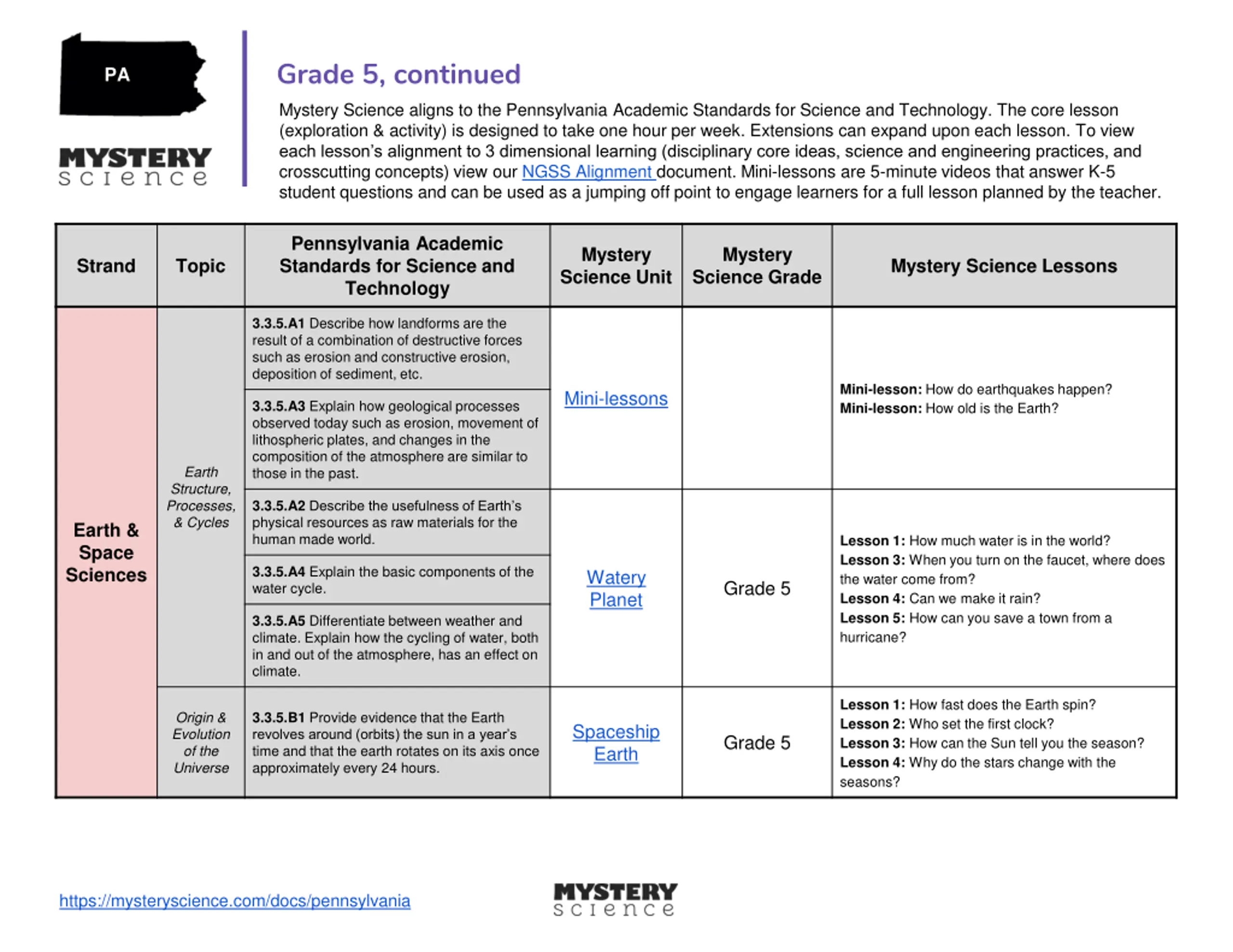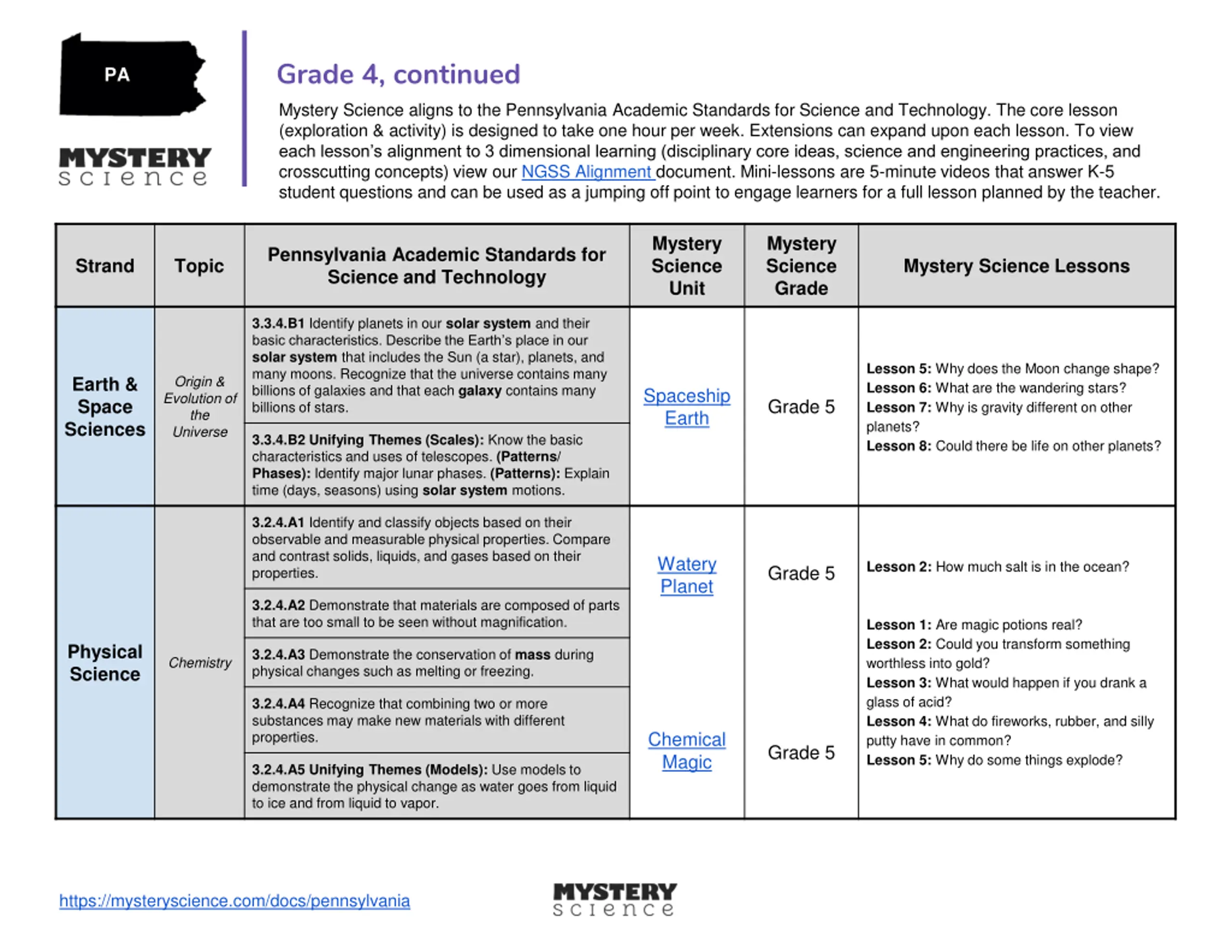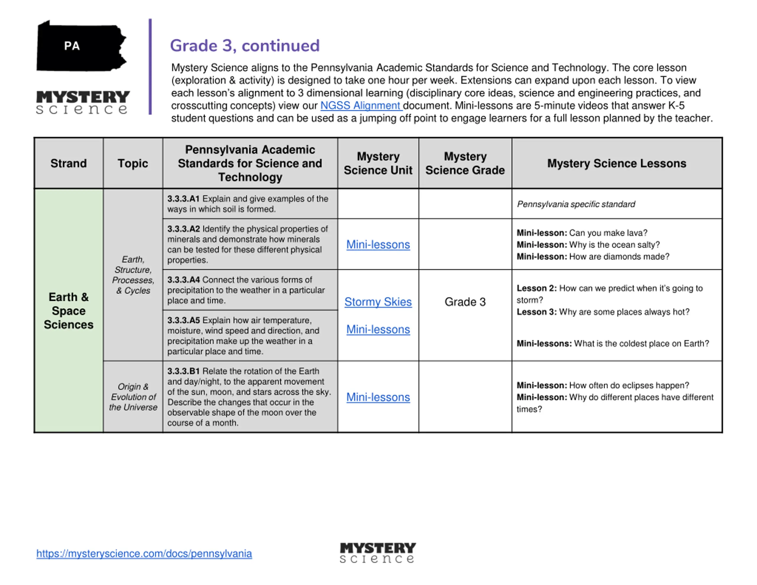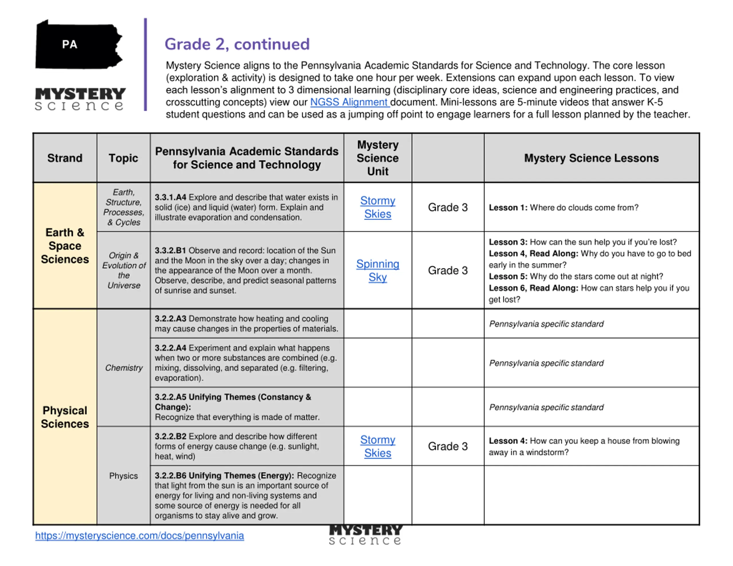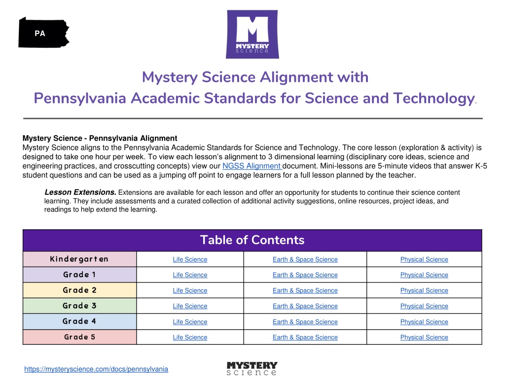 PA Mystery Science Alignment with Pennsylvania Academic Standards for Science and Technology. Mystery Science - Pennsylvania Alignment Mystery Science aligns to the Pennsylvania Academic Standards for Science and Technology. The core lesson (exploration & activity) is designed to take one hour per week. To view each lesson s alignment to 3 dimensional learning (disciplinary core ideas, science and engineering practices, and crosscutting concepts) view our NGSS Alignment document. Mini-lessons are 5-minute videos that answer K-5 student questions and can be used as a jumping off point to engage learners for a full lesson planned by the teacher. Lesson Extensions. Extensions are available for each lesson and offer an opportunity for students to continue their science content learning. They include assessments and a curated collection of additional activity suggestions, online resources, project ideas, and readings to help extend the learning. Table of Contents Kinder gar t en Kinder gar t en Life Science Earth & Space Science Physical Science Gr ade 1 Gr ade 1 Life Science Earth & Space Science Physical Science Gr ade 2 Gr ade 2 Life Science Earth & Space Science Physical Science Gr ade 3 Gr ade 3 Life Science Earth & Space Science Physical Science Gr ade 4 Gr ade 4 Life Science Earth & Space Science Physical Science Gr ade 5 Gr ade 5 Life Science Earth & Space Science Physical Science https://mysteryscience.com/docs/pennsylvania