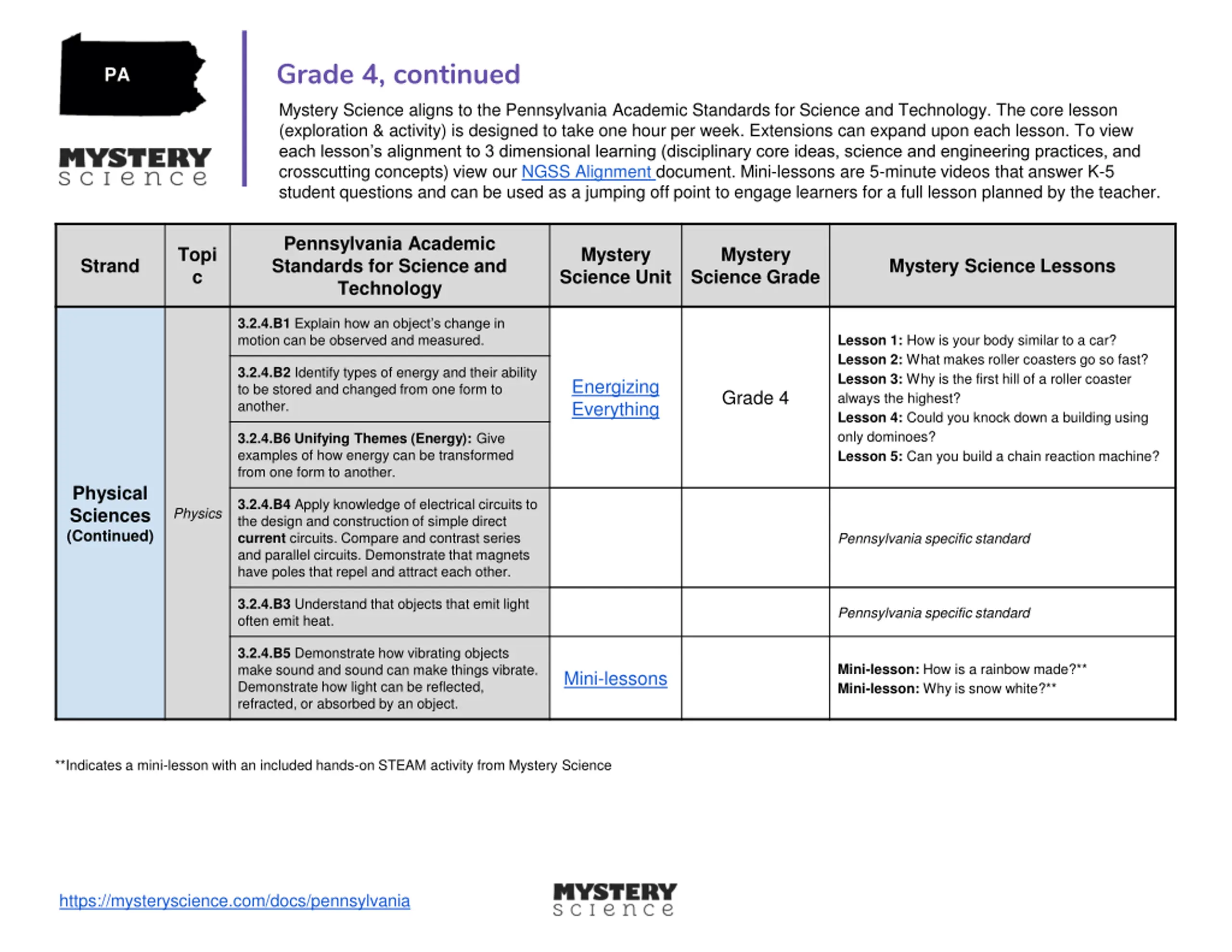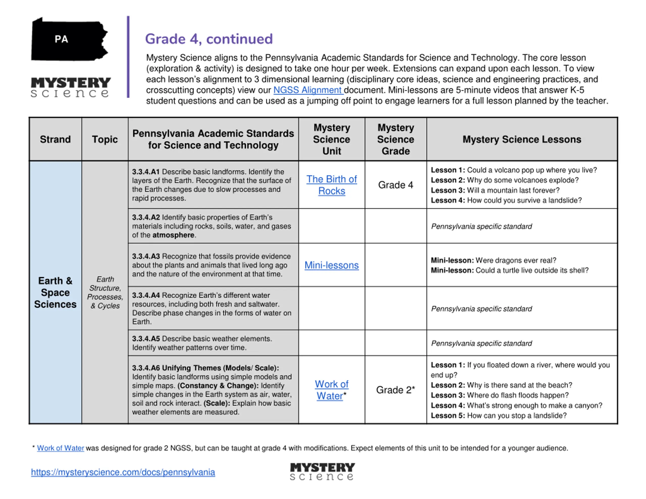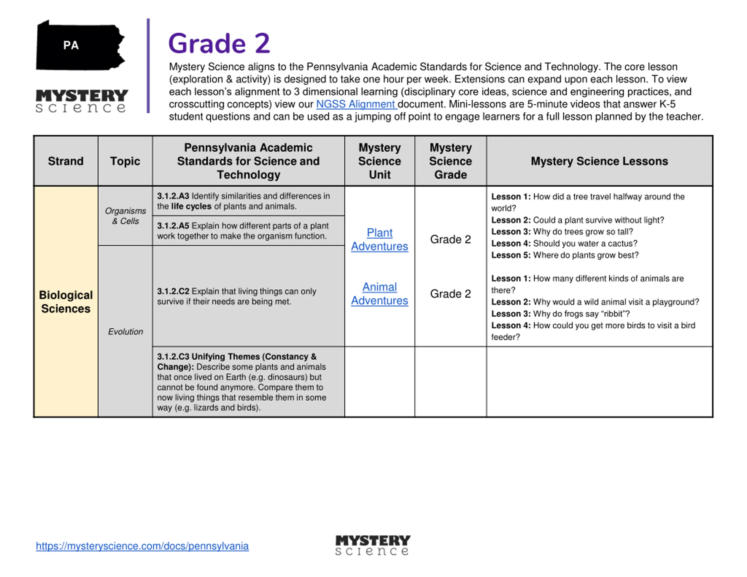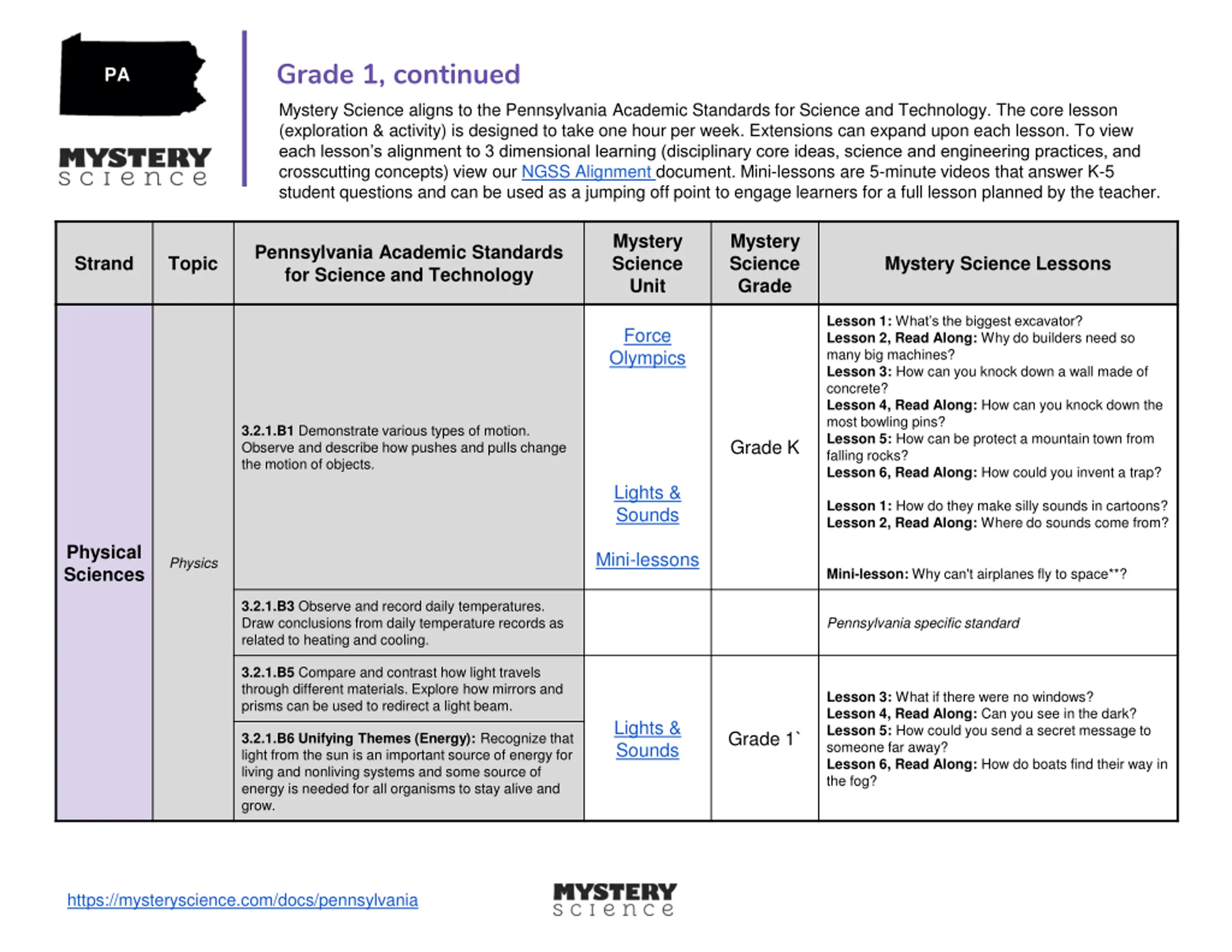 PA Mystery Science Alignment with Pennsylvania Academic Standards for Science and Technology. Mystery Science - Pennsylvania Alignment Mystery Science aligns to the Pennsylvania Academic Standards for Science and Technology. The core lesson (exploration & activity) is designed to take one hour per week. To view each lesson s alignment to 3 dimensional learning (disciplinary core ideas, science and engineering practices, and crosscutting concepts) view our NGSS Alignment document. Mini-lessons are 5-minute videos that answer K-5 student questions and can be used as a jumping off point to engage learners for a full lesson planned by the teacher. Lesson Extensions. Extensions are available for each lesson and offer an opportunity for students to continue their science content learning. They include assessments and a curated collection of additional activity suggestions, online resources, project ideas, and readings to help extend the learning. Table of Contents Kinder gar t en Kinder gar t en Life Science Earth & Space Science Physical Science Gr ade 1 Gr ade 1 Life Science Earth & Space Science Physical Science Gr ade 2 Gr ade 2 Life Science Earth & Space Science Physical Science Gr ade 3 Gr ade 3 Life Science Earth & Space Science Physical Science Gr ade 4 Gr ade 4 Life Science Earth & Space Science Physical Science Gr ade 5 Gr ade 5 Life Science Earth & Space Science Physical Science https://mysteryscience.com/docs/pennsylvania