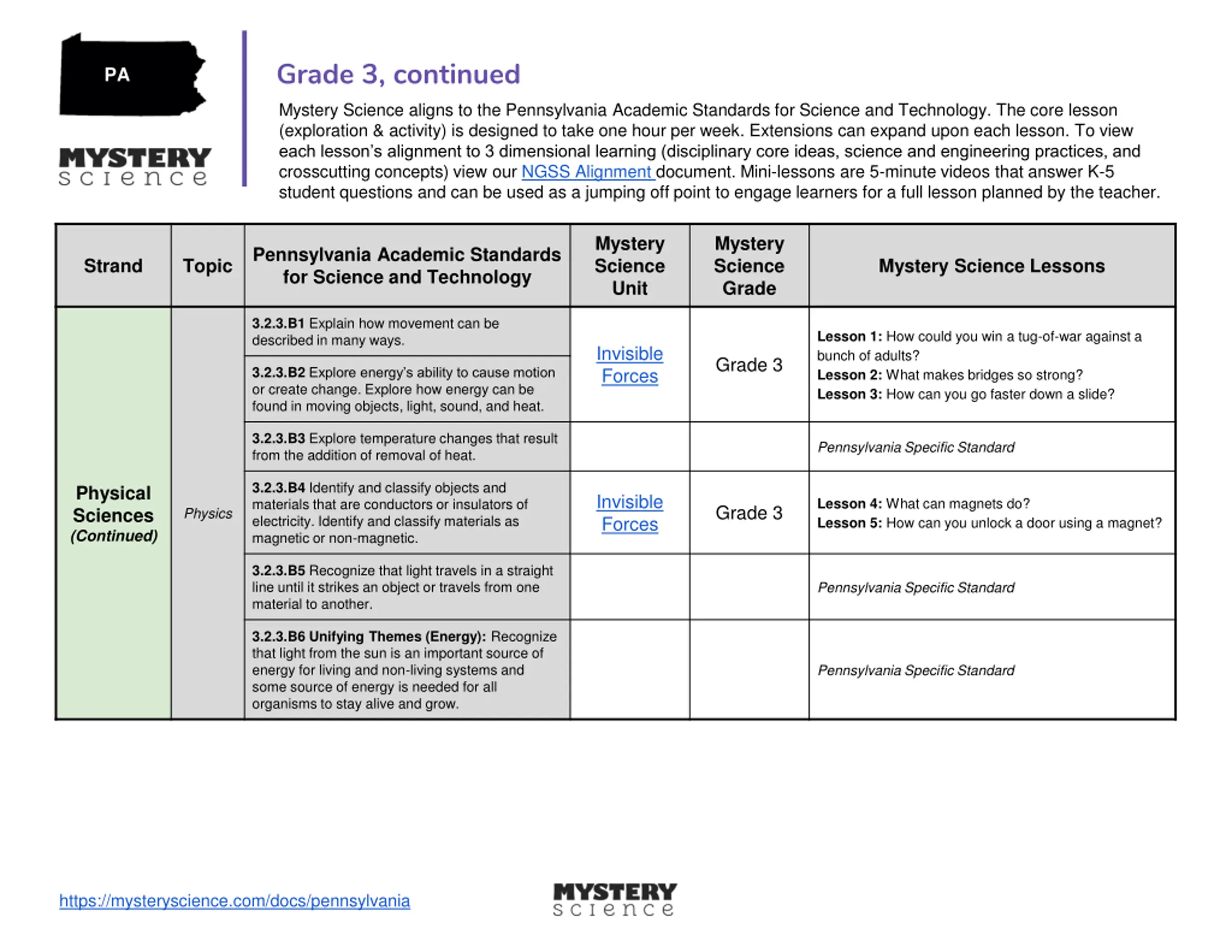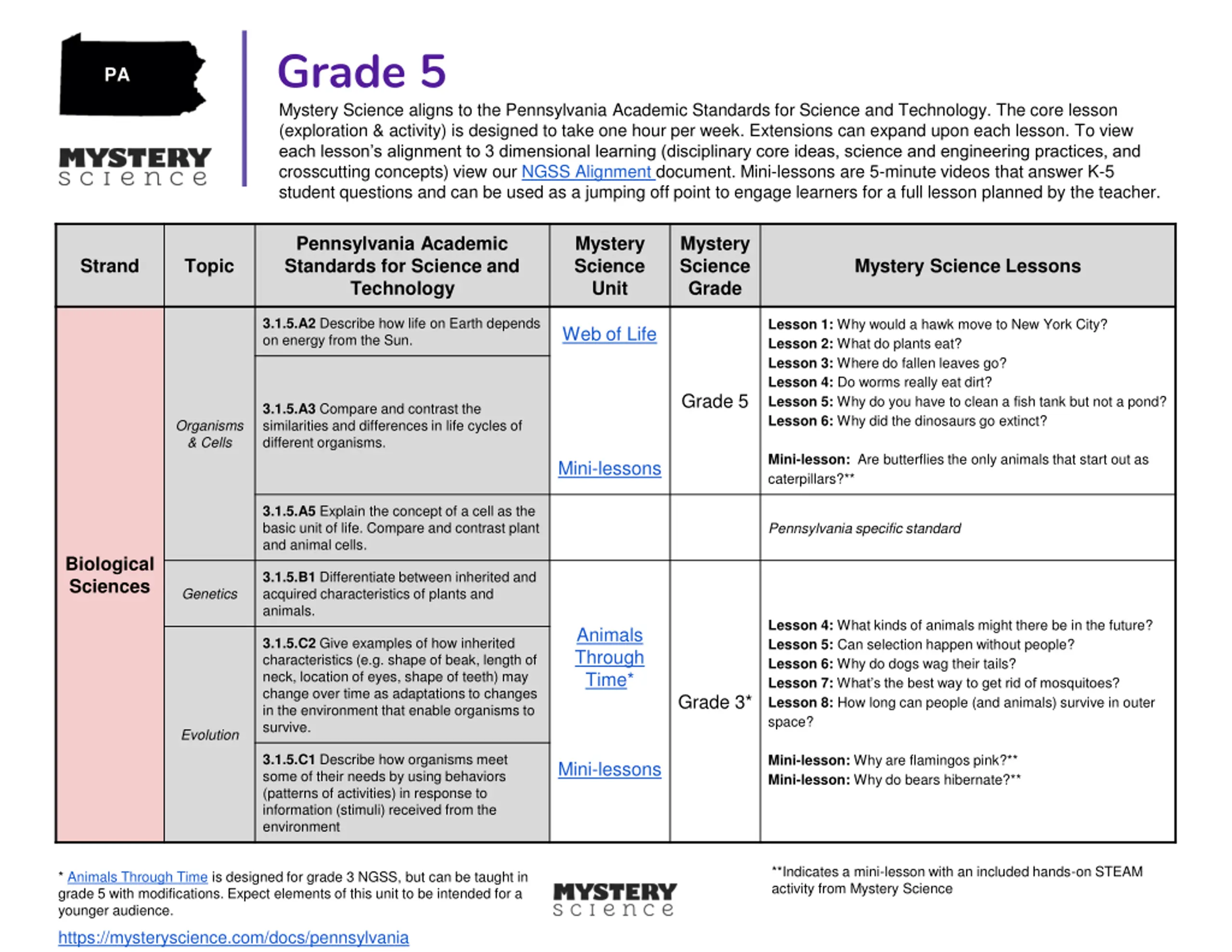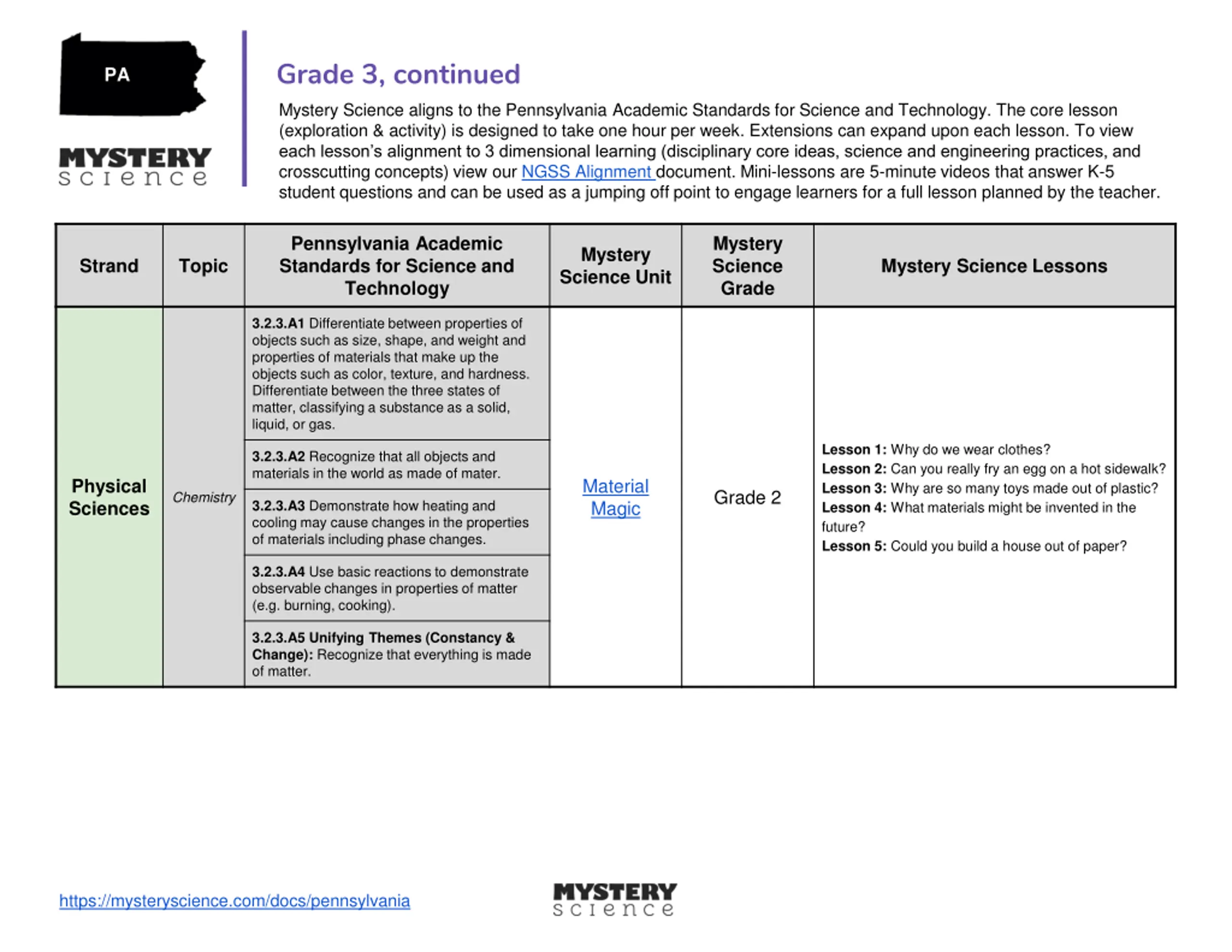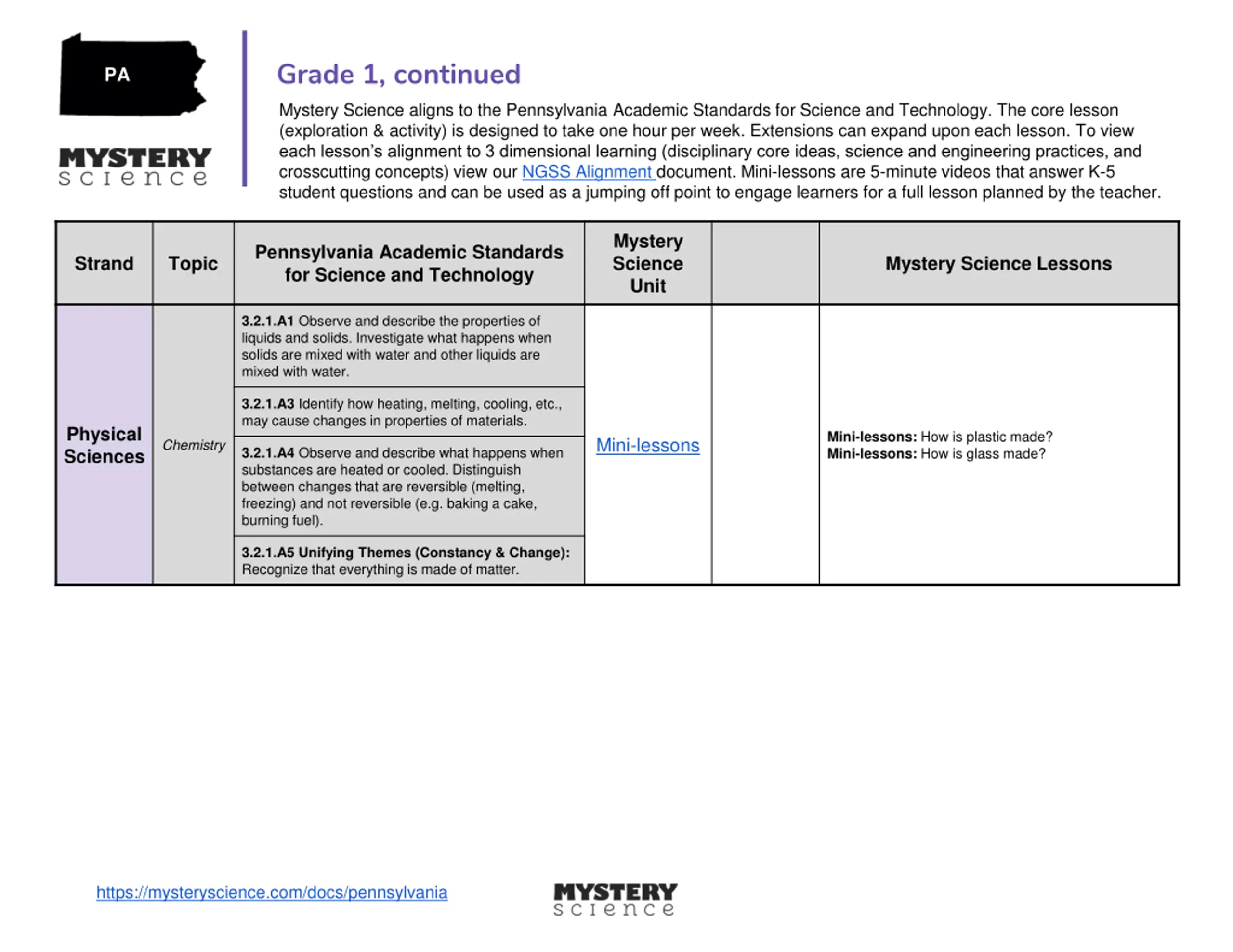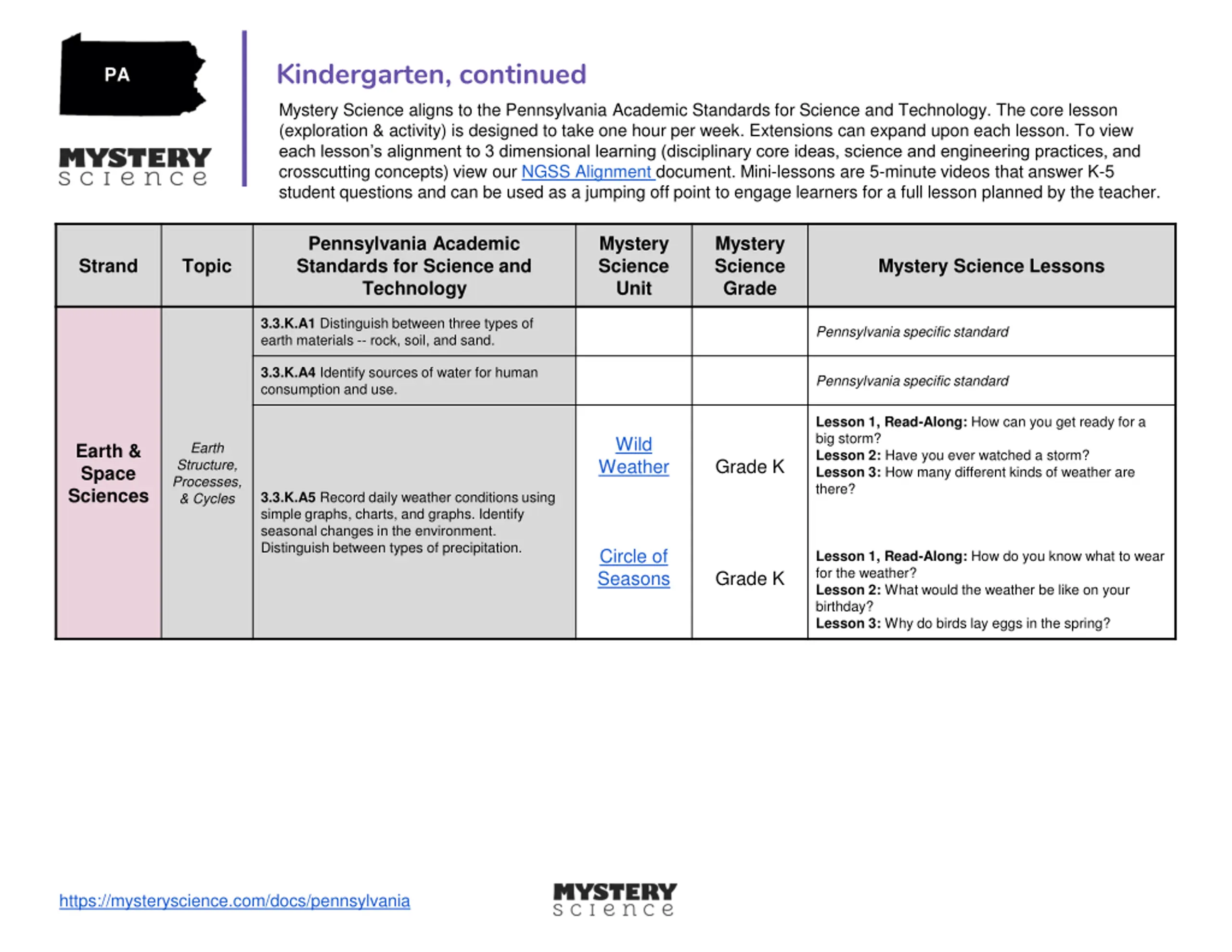 PA Mystery Science Alignment with Pennsylvania Academic Standards for Science and Technology. Mystery Science - Pennsylvania Alignment Mystery Science aligns to the Pennsylvania Academic Standards for Science and Technology. The core lesson (exploration & activity) is designed to take one hour per week. To view each lesson s alignment to 3 dimensional learning (disciplinary core ideas, science and engineering practices, and crosscutting concepts) view our NGSS Alignment document. Mini-lessons are 5-minute videos that answer K-5 student questions and can be used as a jumping off point to engage learners for a full lesson planned by the teacher. Lesson Extensions. Extensions are available for each lesson and offer an opportunity for students to continue their science content learning. They include assessments and a curated collection of additional activity suggestions, online resources, project ideas, and readings to help extend the learning. Table of Contents Kinder gar t en Kinder gar t en Life Science Earth & Space Science Physical Science Gr ade 1 Gr ade 1 Life Science Earth & Space Science Physical Science Gr ade 2 Gr ade 2 Life Science Earth & Space Science Physical Science Gr ade 3 Gr ade 3 Life Science Earth & Space Science Physical Science Gr ade 4 Gr ade 4 Life Science Earth & Space Science Physical Science Gr ade 5 Gr ade 5 Life Science Earth & Space Science Physical Science https://mysteryscience.com/docs/pennsylvania