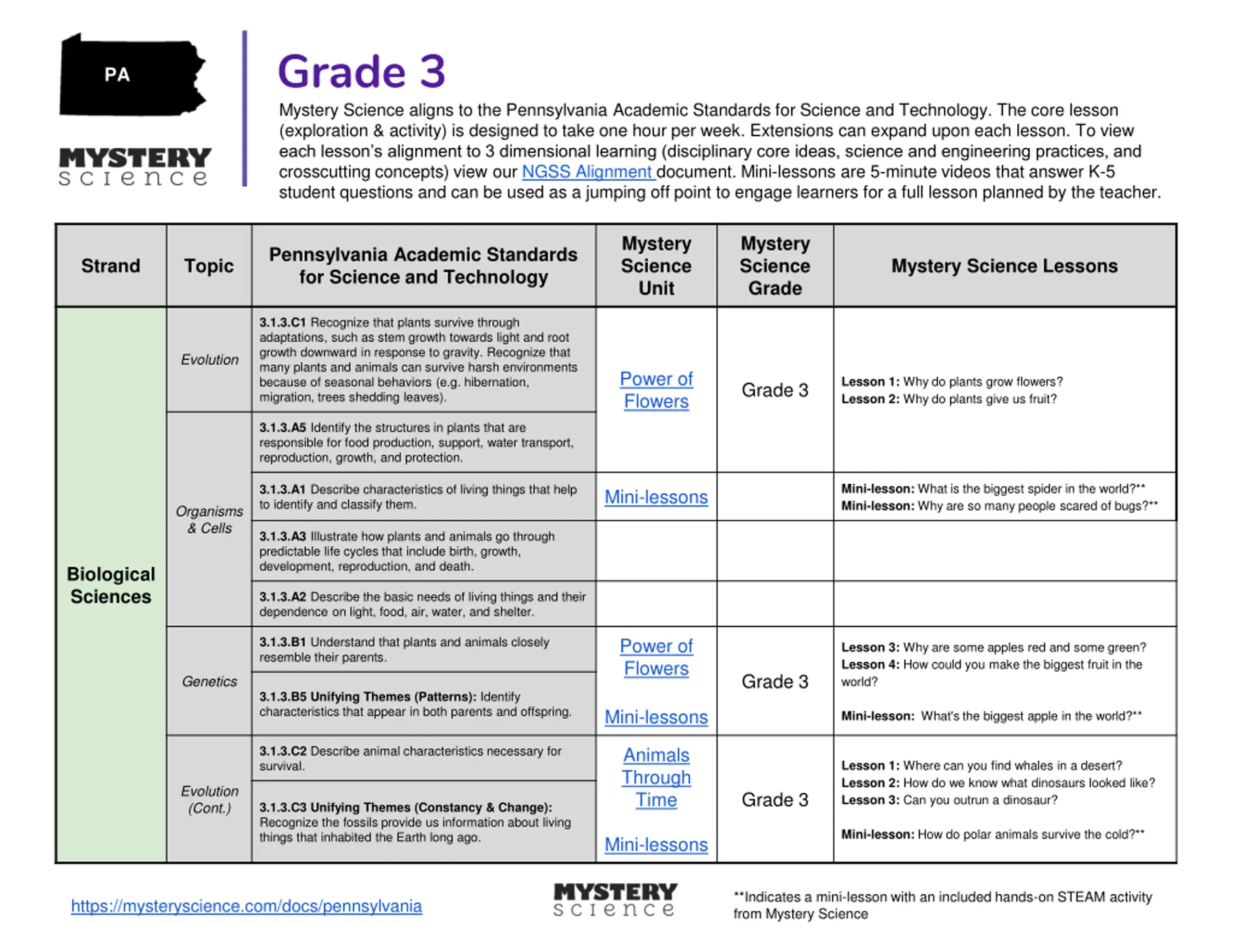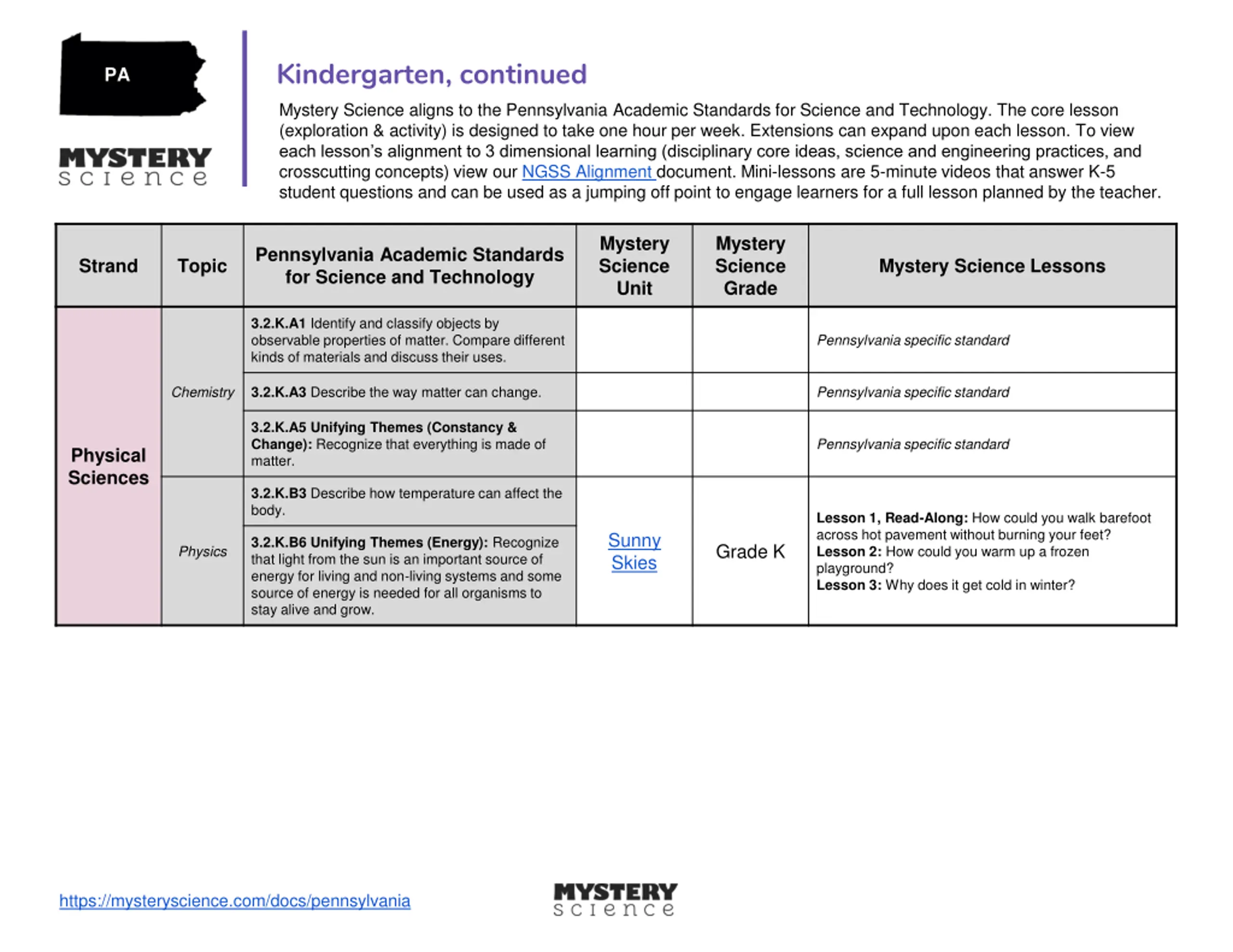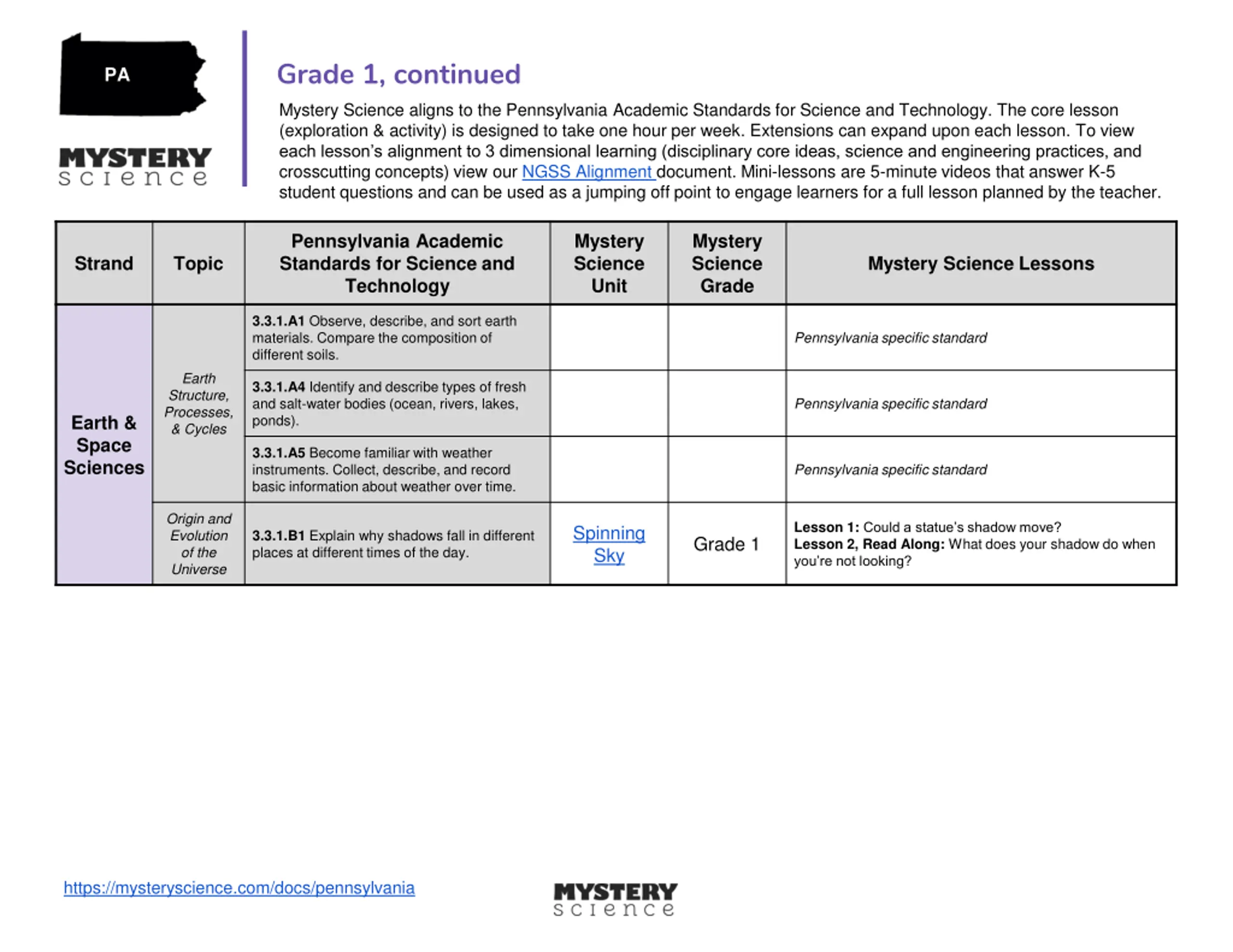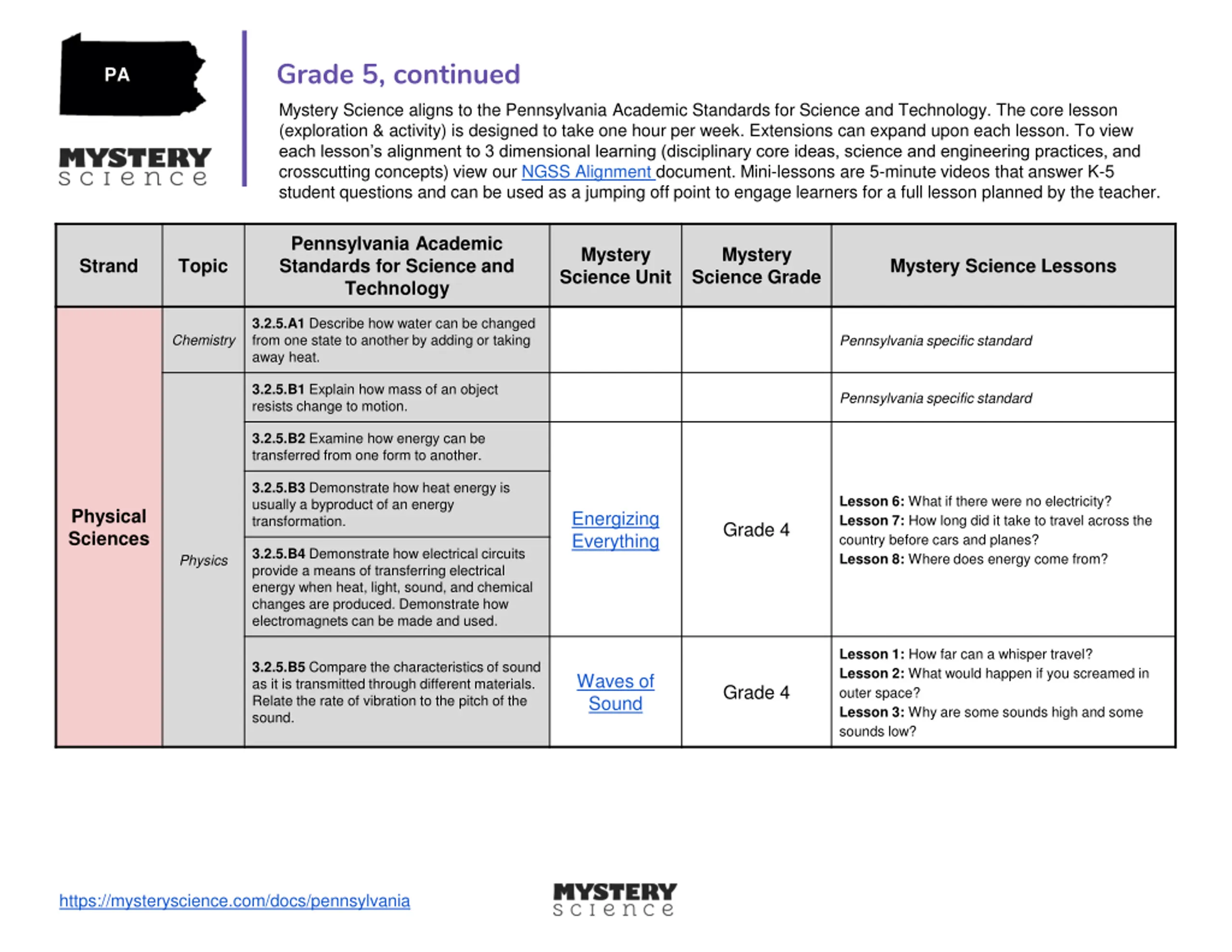 PA Mystery Science Alignment with Pennsylvania Academic Standards for Science and Technology. Mystery Science - Pennsylvania Alignment Mystery Science aligns to the Pennsylvania Academic Standards for Science and Technology. The core lesson (exploration & activity) is designed to take one hour per week. To view each lesson s alignment to 3 dimensional learning (disciplinary core ideas, science and engineering practices, and crosscutting concepts) view our NGSS Alignment document. Mini-lessons are 5-minute videos that answer K-5 student questions and can be used as a jumping off point to engage learners for a full lesson planned by the teacher. Lesson Extensions. Extensions are available for each lesson and offer an opportunity for students to continue their science content learning. They include assessments and a curated collection of additional activity suggestions, online resources, project ideas, and readings to help extend the learning. Table of Contents Kinder gar t en Kinder gar t en Life Science Earth & Space Science Physical Science Gr ade 1 Gr ade 1 Life Science Earth & Space Science Physical Science Gr ade 2 Gr ade 2 Life Science Earth & Space Science Physical Science Gr ade 3 Gr ade 3 Life Science Earth & Space Science Physical Science Gr ade 4 Gr ade 4 Life Science Earth & Space Science Physical Science Gr ade 5 Gr ade 5 Life Science Earth & Space Science Physical Science https://mysteryscience.com/docs/pennsylvania