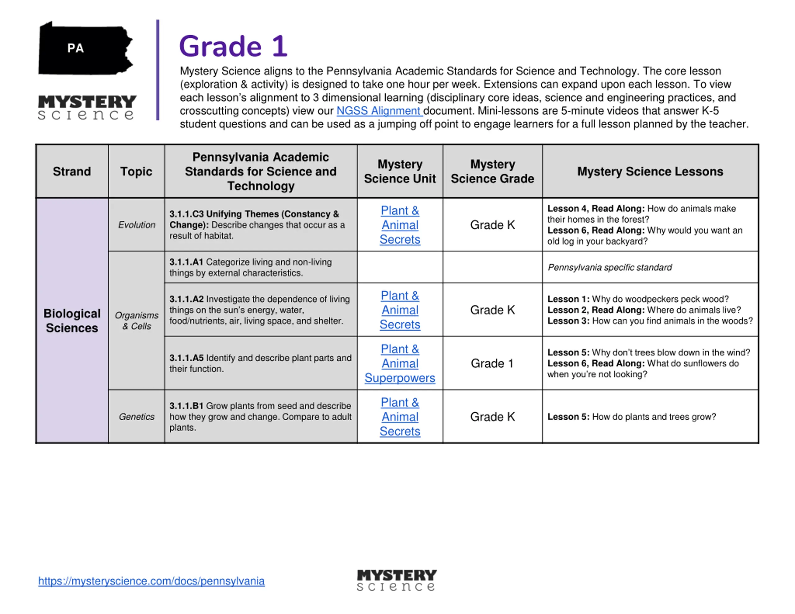 Grade 1 Mystery Science aligns to the Pennsylvania Academic Standards for Science and Technology. The core lesson (exploration & activity) is designed to take one hour per week. Extensions can expand upon each lesson. To view each lesson s alignment to 3 dimensional learning (disciplinary core ideas, science and engineering practices, and crosscutting concepts) view our NGSS Alignment document. Mini-lessons are 5-minute videos that answer K-5 student questions and can be used as a jumping off point to engage learners for a full lesson planned by the teacher. PA Pennsylvania Academic Standards for Science and Technology Mystery Science Unit Mystery Science Grade Strand Topic Mystery Science Lessons Lesson 4, Read Along: How do animals make their homes in the forest? Lesson 6, Read Along: Why would you want an old log in your backyard? Plant & Animal Secrets 3.1.1.C3 Unifying Themes (Constancy & Change): Describe changes that occur as a result of habitat. Grade K Evolution 3.1.1.A1 Categorize living and non-living things by external characteristics. Pennsylvania specific standard Plant & Animal Secrets 3.1.1.A2 Investigate the dependence of living things on the sun s energy, water, food/nutrients, air, living space, and shelter. Lesson 1: Why do woodpeckers peck wood? Lesson 2, Read Along: Where do animals live? Lesson 3: How can you find animals in the woods? Grade K Biological Sciences Organisms & Cells Plant & Animal Superpowers Lesson 5: Why don t trees blow down in the wind? Lesson 6, Read Along: What do sunflowers do when you re not looking? 3.1.1.A5 Identify and describe plant parts and their function. Grade 1 Plant & Animal Secrets 3.1.1.B1 Grow plants from seed and describe how they grow and change. Compare to adult plants. Grade K Genetics Lesson 5: How do plants and trees grow? https://mysteryscience.com/docs/pennsylvania