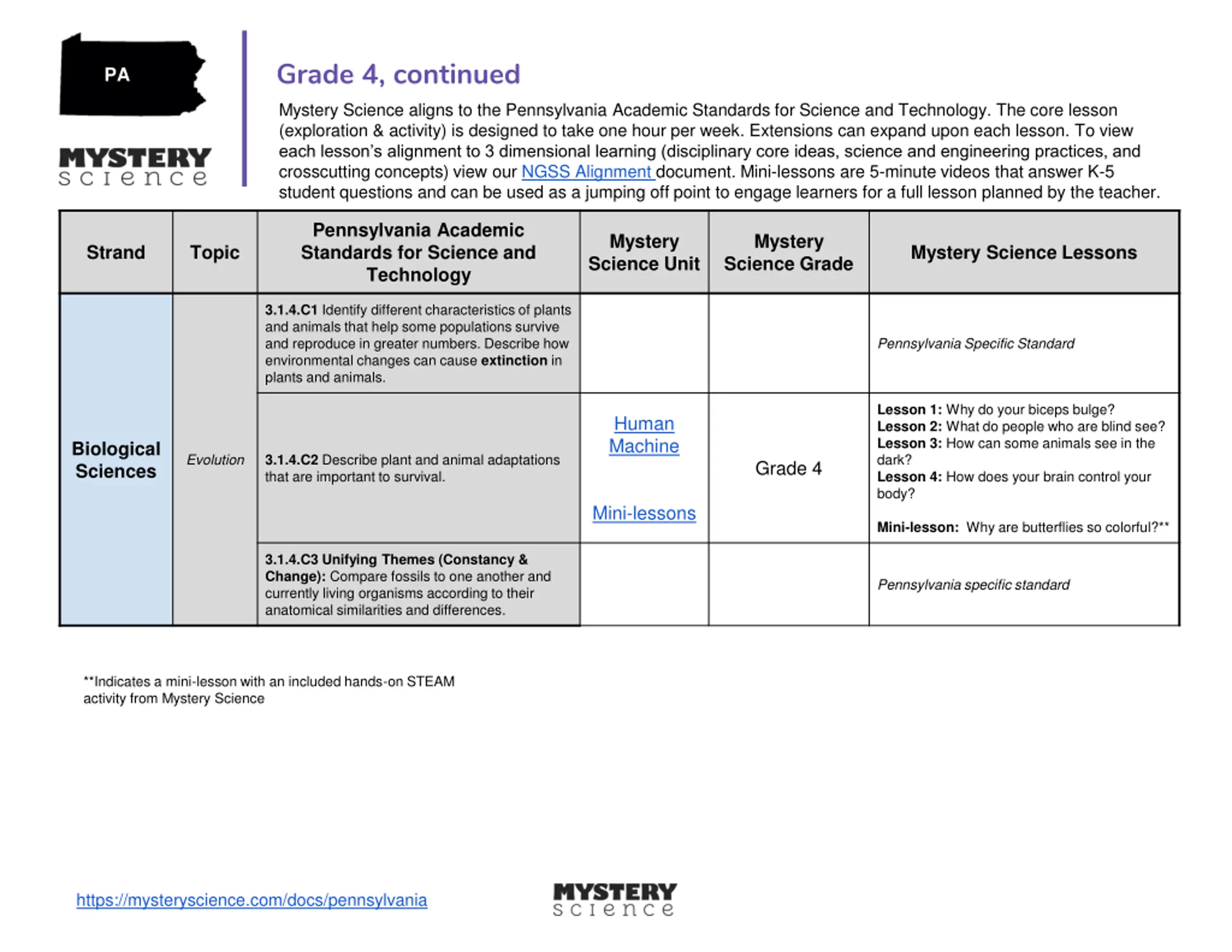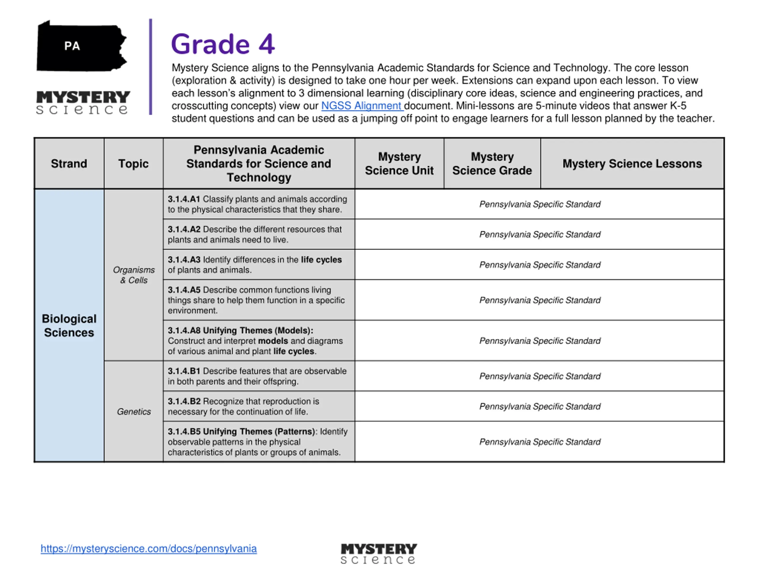 Grade 4 Mystery Science aligns to the Pennsylvania Academic Standards for Science and Technology. The core lesson (exploration & activity) is designed to take one hour per week. Extensions can expand upon each lesson. To view each lesson s alignment to 3 dimensional learning (disciplinary core ideas, science and engineering practices, and crosscutting concepts) view our NGSS Alignment document. Mini-lessons are 5-minute videos that answer K-5 student questions and can be used as a jumping off point to engage learners for a full lesson planned by the teacher. PA Pennsylvania Academic Standards for Science and Technology Mystery Science Unit Mystery Science Grade Strand Topic Mystery Science Lessons 3.1.4.A1 Classify plants and animals according to the physical characteristics that they share. Pennsylvania Specific Standard 3.1.4.A2 Describe the different resources that plants and animals need to live. Pennsylvania Specific Standard 3.1.4.A3 Identify differences in the life cycles of plants and animals. Pennsylvania Specific Standard Organisms & Cells 3.1.4.A5 Describe common functions living things share to help them function in a specific environment. Pennsylvania Specific Standard Biological Sciences 3.1.4.A8 Unifying Themes (Models): Construct and interpret models and diagrams of various animal and plant life cycles. Pennsylvania Specific Standard 3.1.4.B1 Describe features that are observable in both parents and their offspring. Pennsylvania Specific Standard 3.1.4.B2 Recognize that reproduction is necessary for the continuation of life. Pennsylvania Specific Standard Genetics 3.1.4.B5 Unifying Themes (Patterns): Identify observable patterns in the physical characteristics of plants or groups of animals. Pennsylvania Specific Standard https://mysteryscience.com/docs/pennsylvania