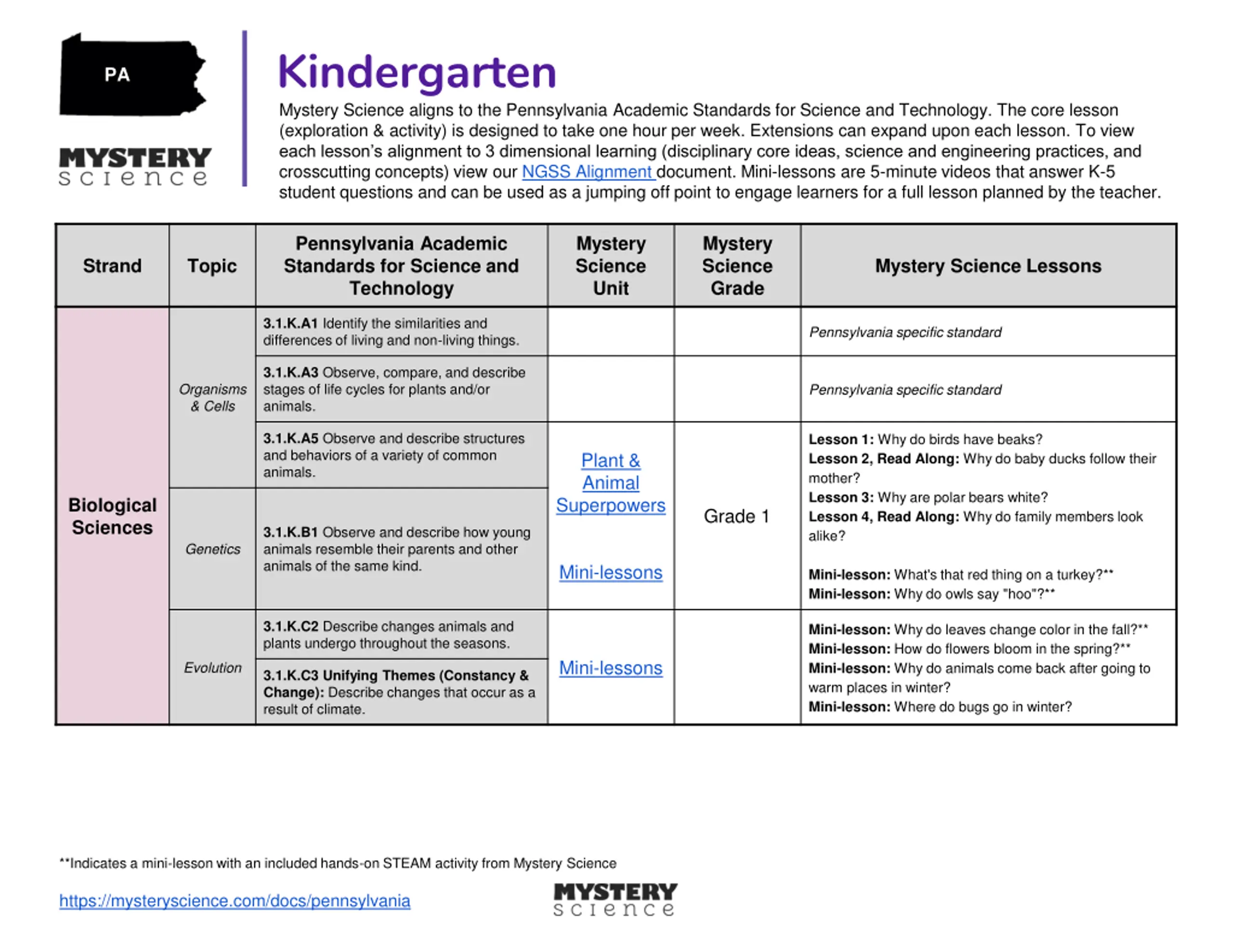 Kindergarten Mystery Science aligns to the Pennsylvania Academic Standards for Science and Technology. The core lesson (exploration & activity) is designed to take one hour per week. Extensions can expand upon each lesson. To view each lesson s alignment to 3 dimensional learning (disciplinary core ideas, science and engineering practices, and crosscutting concepts) view our NGSS Alignment document. Mini-lessons are 5-minute videos that answer K-5 student questions and can be used as a jumping off point to engage learners for a full lesson planned by the teacher. PA Pennsylvania Academic Standards for Science and Technology Mystery Science Unit Mystery Science Grade Strand Topic Mystery Science Lessons 3.1.K.A1 Identify the similarities and differences of living and non-living things. Pennsylvania specific standard 3.1.K.A3 Observe, compare, and describe stages of life cycles for plants and/or animals. Organisms & Cells Pennsylvania specific standard 3.1.K.A5 Observe and describe structures and behaviors of a variety of common animals. Lesson 1: Why do birds have beaks? Lesson 2, Read Along: Why do baby ducks follow their mother? Lesson 3: Why are polar bears white? Lesson 4, Read Along: Why do family members look alike? Plant & Animal Superpowers Biological Sciences Grade 1 3.1.K.B1 Observe and describe how young animals resemble their parents and other animals of the same kind. Genetics Mini-lessons Mini-lesson: What's that red thing on a turkey?** Mini-lesson: Why do owls say "hoo"?** 3.1.K.C2 Describe changes animals and plants undergo throughout the seasons. Mini-lesson: Why do leaves change color in the fall?** Mini-lesson: How do flowers bloom in the spring?** Mini-lesson: Why do animals come back after going to warm places in winter? Mini-lesson: Where do bugs go in winter? Mini-lessons Evolution 3.1.K.C3 Unifying Themes (Constancy & Change): Describe changes that occur as a result of climate. **Indicates a mini-lesson with an included hands-on STEAM activity from Mystery Science https://mysteryscience.com/docs/pennsylvania
