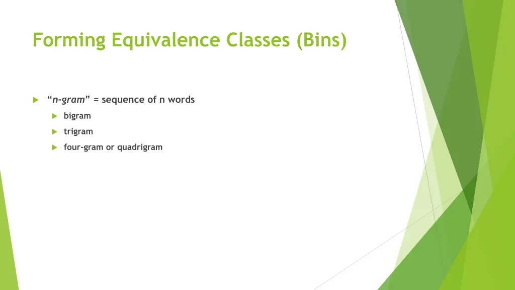 Forming Equivalence Classes (Bins) n-gram = sequence of n words bigram trigram four-gram or quadrigram