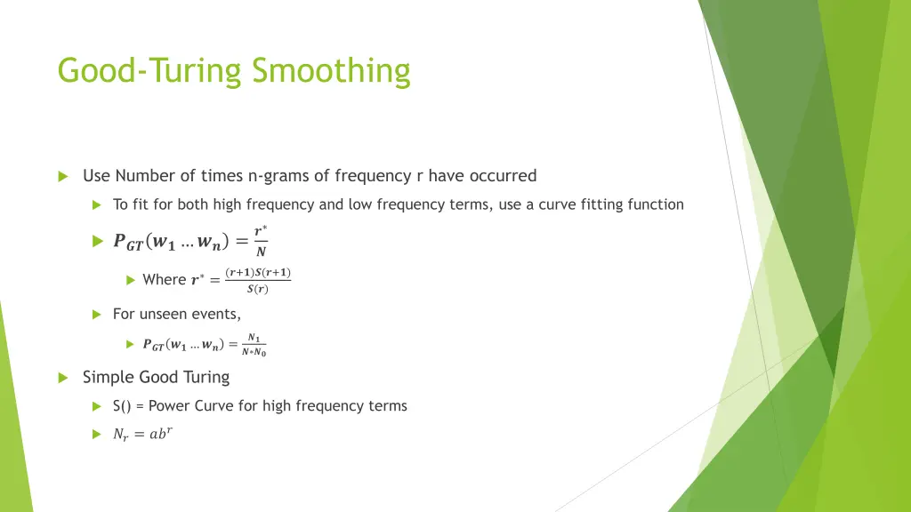 Good-Turing Smoothing Use Number of times n-grams of frequency r have occurred To fit for both high frequency and low frequency terms, use a curve fitting function ????? ?? =? ? Where ? =(?+?)?(?+?) ?(?) For unseen events, ?? ? ?? ????? ?? = Simple Good Turing S() = Power Curve for high frequency terms ??= ???