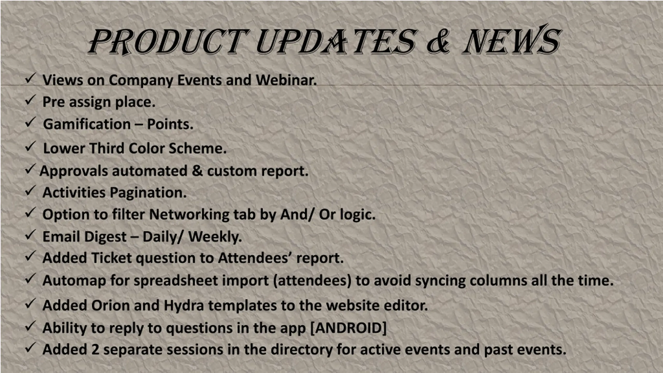 PRODUCT UPDATES & NEWs Views on Company Events and Webinar. Pre assign place. Gamification Points. Lower Third Color Scheme. Approvals automated & custom report. Activities Pagination. Option to filter Networking tab by And/ Or logic. Email Digest Daily/ Weekly. Added Ticket question to Attendees report. Automap for spreadsheet import (attendees) to avoid syncing columns all the time. Added Orion and Hydra templates to the website editor. Ability to reply to questions in the app [ANDROID] Added 2 separate sessions in the directory for active events and past events.
