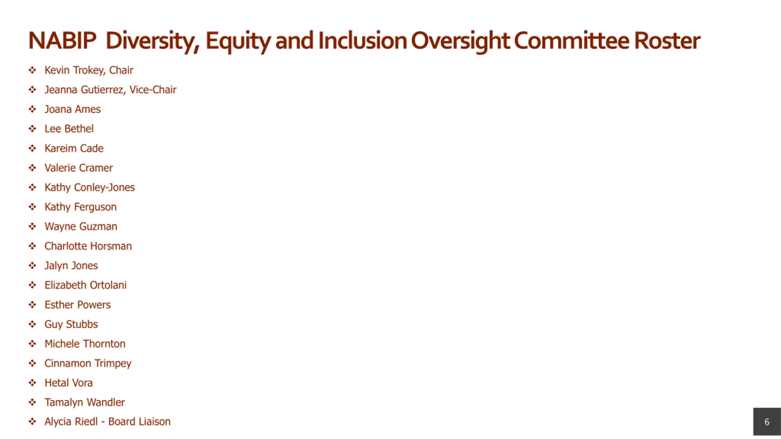NABIP Diversity, Equity and Inclusion Oversight Committee Roster Kevin Trokey, Chair Jeanna Gutierrez, Vice-Chair Joana Ames Lee Bethel Kareim Cade Valerie Cramer Kathy Conley-Jones Kathy Ferguson Wayne Guzman Charlotte Horsman Jalyn Jones Elizabeth Ortolani Esther Powers Guy Stubbs Michele Thornton Cinnamon Trimpey Hetal Vora Tamalyn Wandler Alycia Riedl - Board Liaison 6