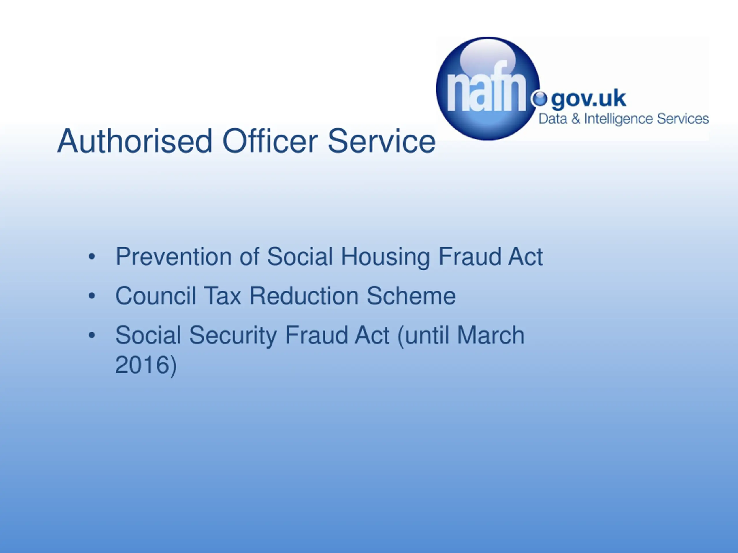 Authorised Officer Service Prevention of Social Housing Fraud Act Council Tax Reduction Scheme Social Security Fraud Act (until March 2016)