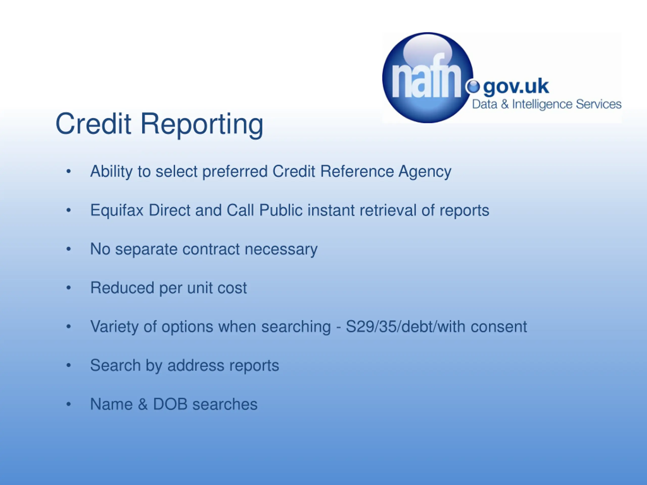 Credit Reporting Ability to select preferred Credit Reference Agency Equifax Direct and Call Public instant retrieval of reports No separate contract necessary Reduced per unit cost Variety of options when searching - S29/35/debt/with consent Search by address reports Name & DOB searches