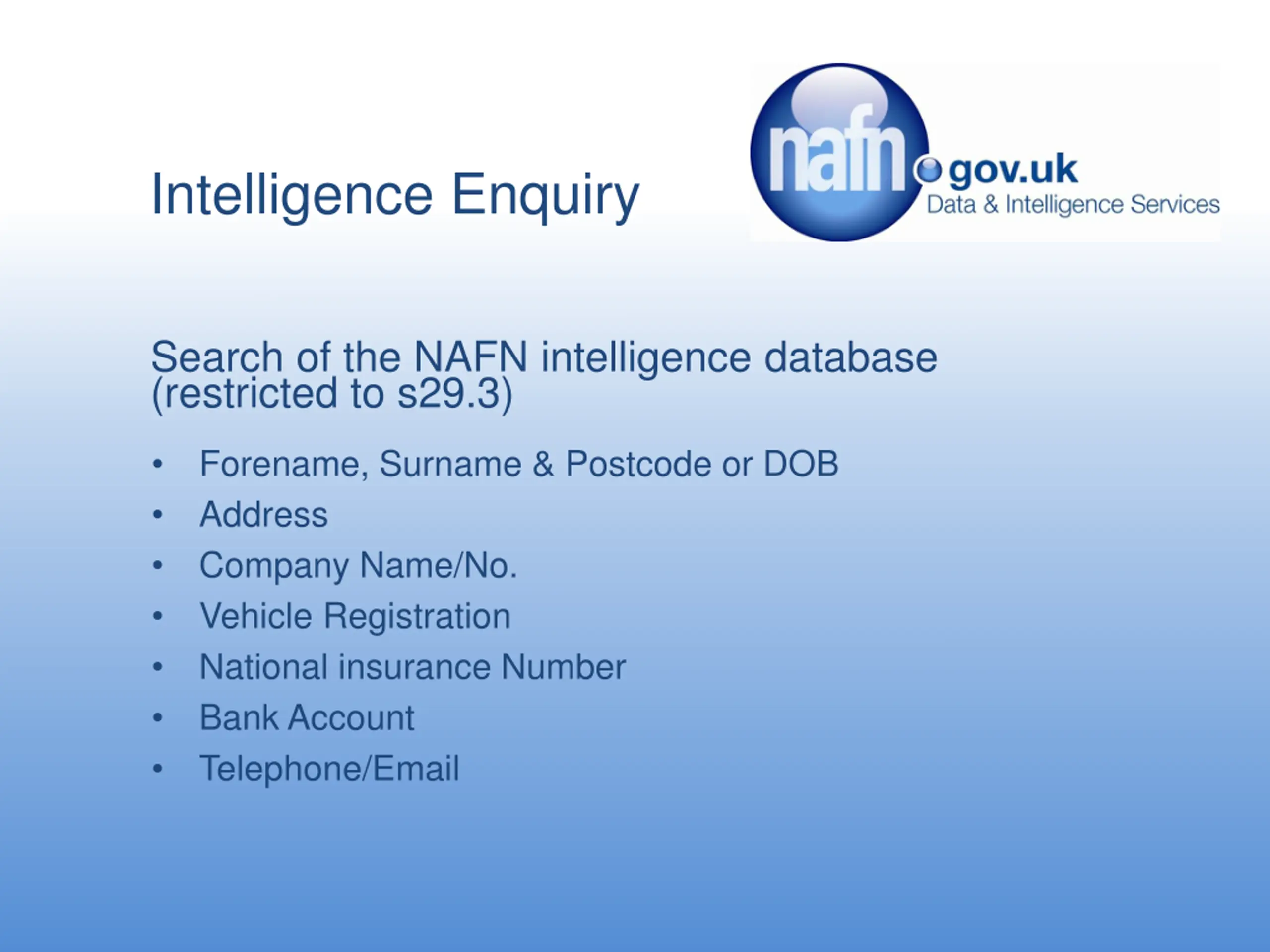 Intelligence Enquiry Search of the NAFN intelligence database (restricted to s29.3) Forename, Surname & Postcode or DOB Address Company Name/No. Vehicle Registration National insurance Number Bank Account Telephone/Email