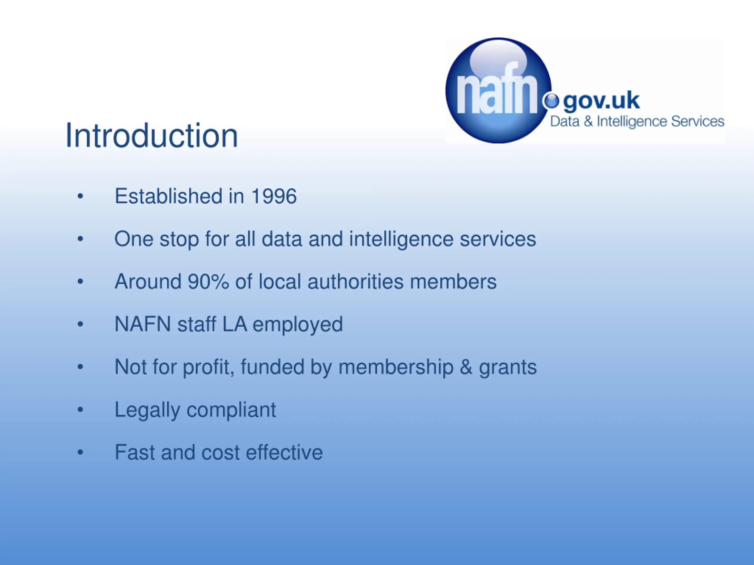 Introduction Established in 1996 One stop for all data and intelligence services Around 90% of local authorities members NAFN staff LA employed Not for profit, funded by membership & grants Legally compliant Fast and cost effective