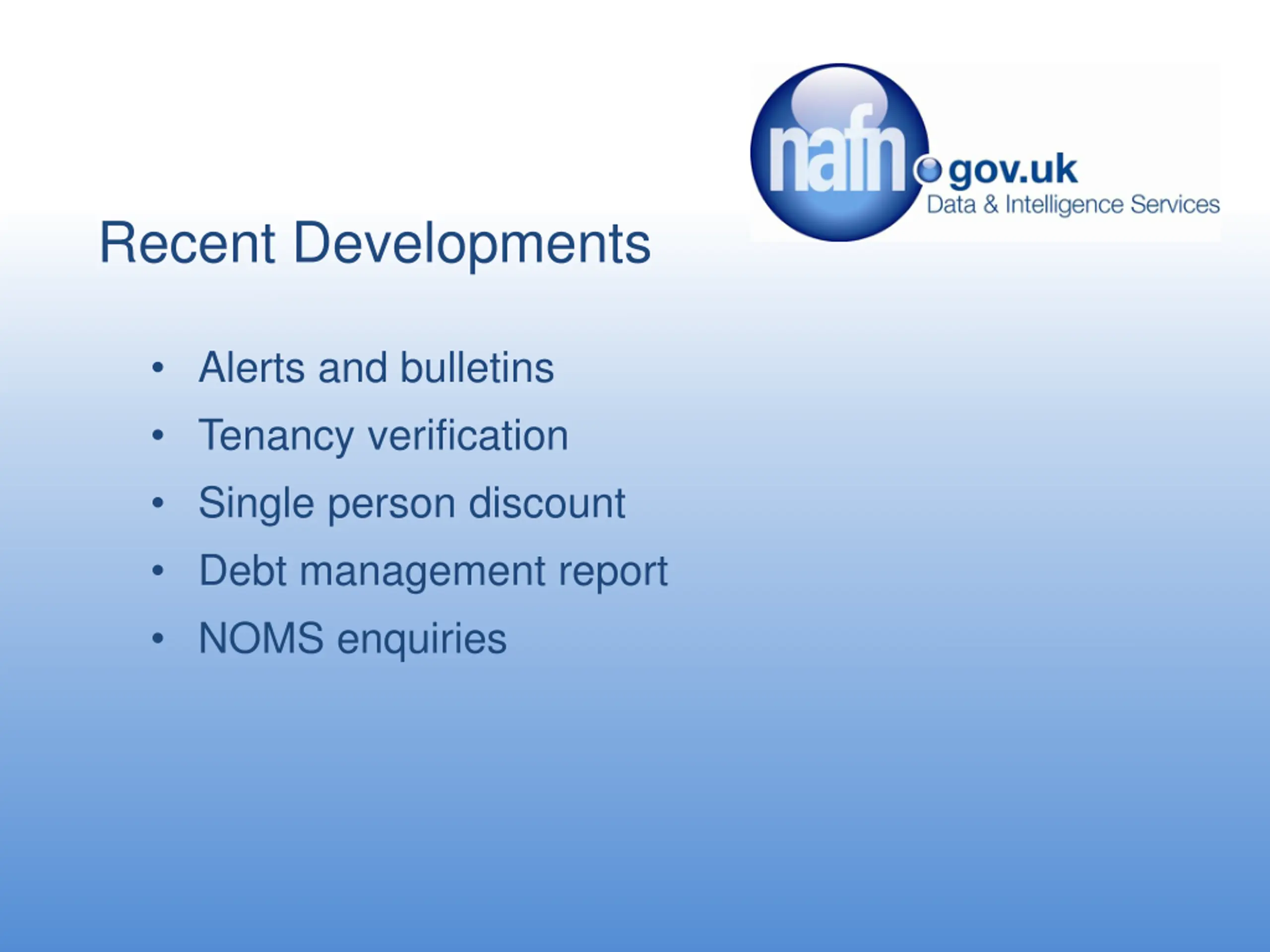 Recent Developments Alerts and bulletins Tenancy verification Single person discount Debt management report NOMS enquiries