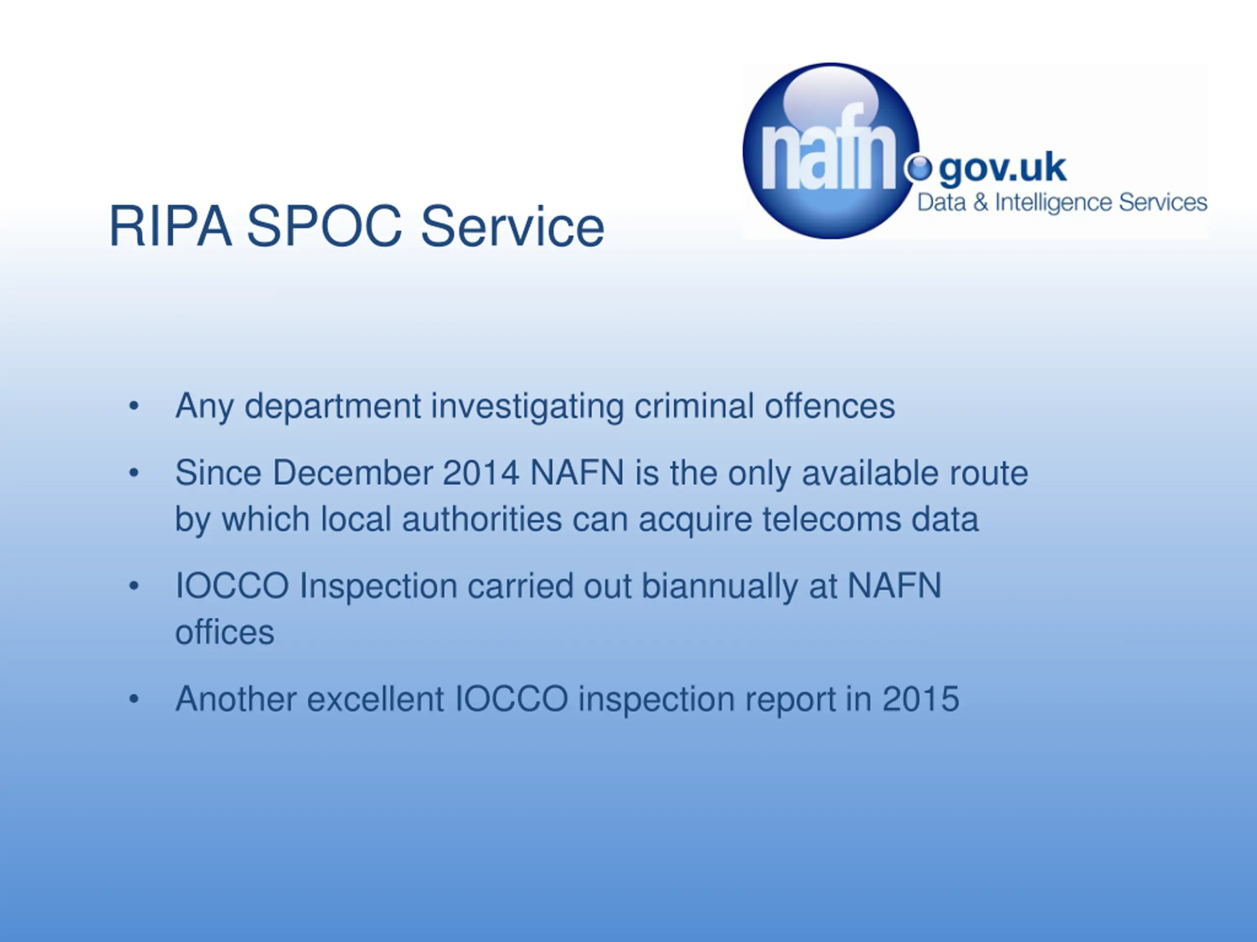 RIPA SPOC Service Any department investigating criminal offences Since December 2014 NAFN is the only available route by which local authorities can acquire telecoms data IOCCO Inspection carried out biannually at NAFN offices Another excellent IOCCO inspection report in 2015