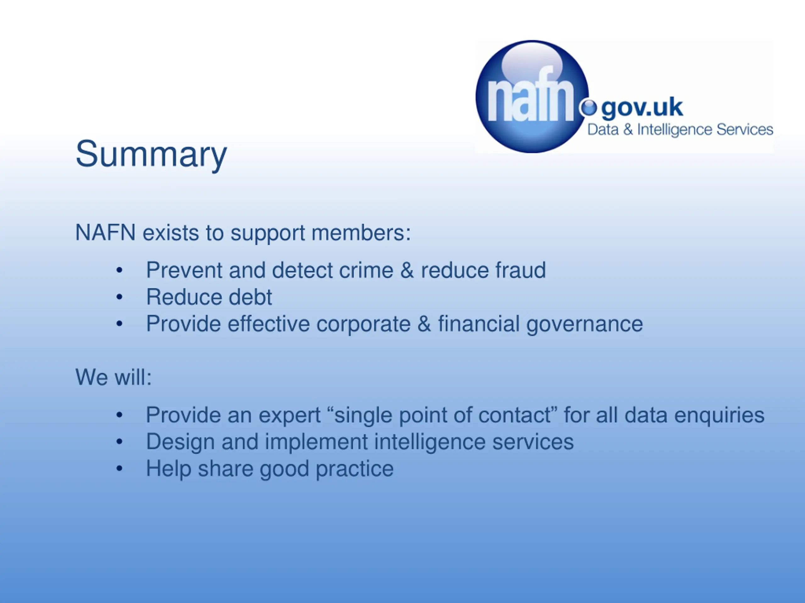 Summary NAFN exists to support members: Prevent and detect crime & reduce fraud Reduce debt Provide effective corporate & financial governance We will: Provide an expert single point of contact for all data enquiries Design and implement intelligence services Help share good practice