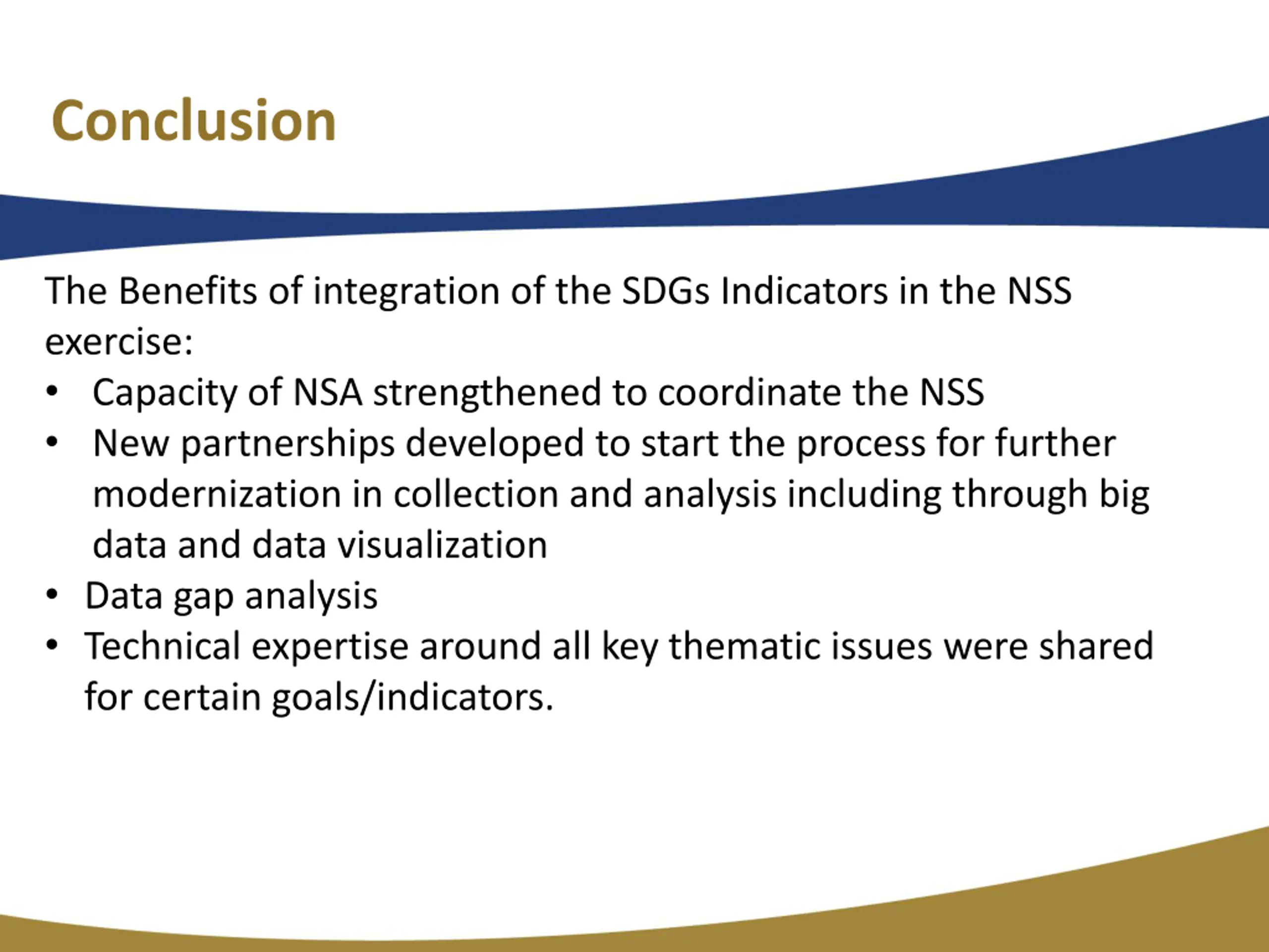 Conclusion The Benefits of integration of the SDGs Indicators in the NSS exercise: Capacity of NSA strengthened to coordinate the NSS New partnerships developed to start the process for further modernization in collection and analysis including through big data and data visualization Data gap analysis Technical expertise around all key thematic issues were shared for certain goals/indicators.