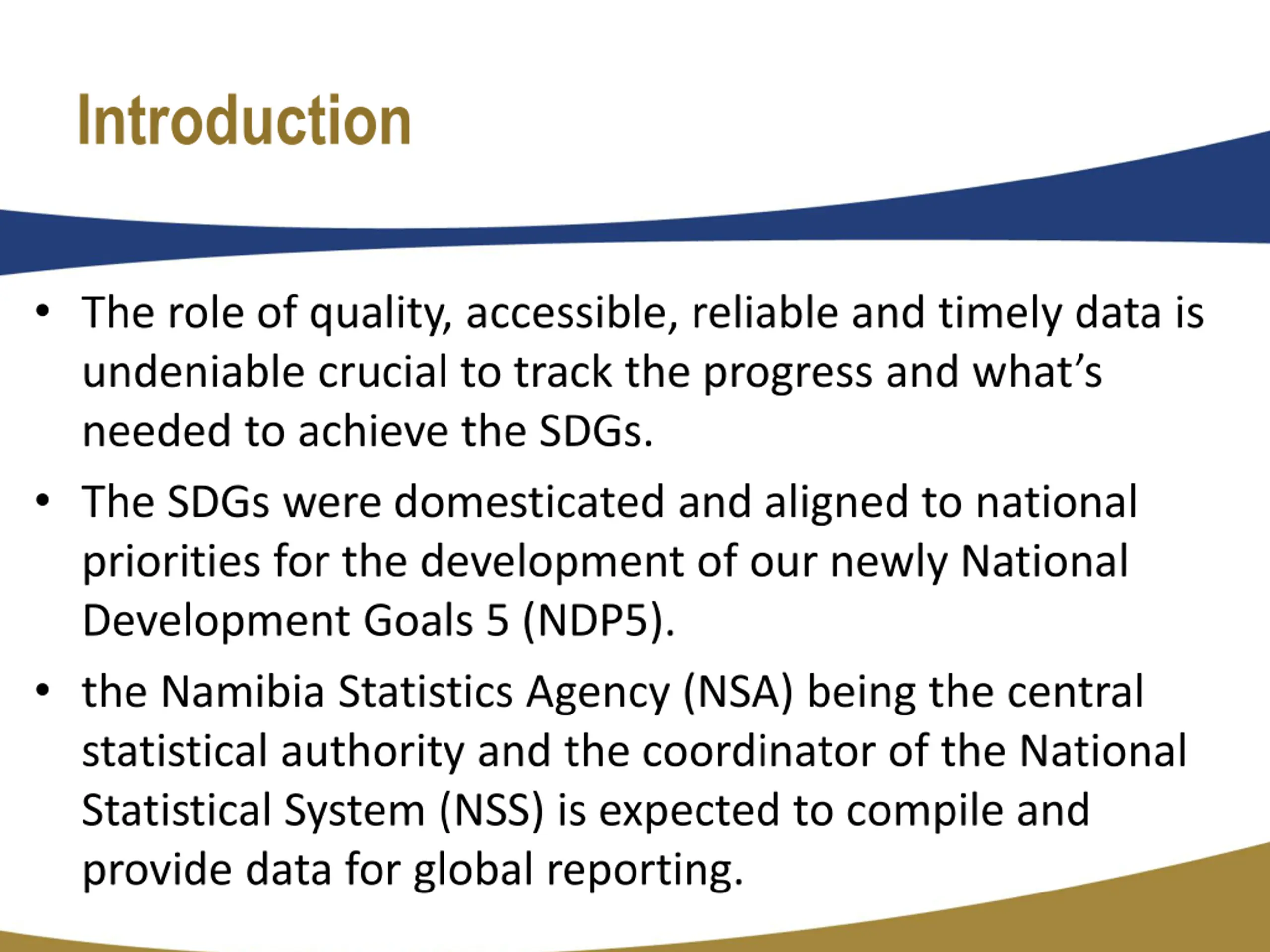 Introduction The role of quality, accessible, reliable and timely data is undeniable crucial to track the progress and what s needed to achieve the SDGs. The SDGs were domesticated and aligned to national priorities for the development of our newly National Development Goals 5 (NDP5). the Namibia Statistics Agency (NSA) being the central statistical authority and the coordinator of the National Statistical System (NSS) is expected to compile and provide data for global reporting.