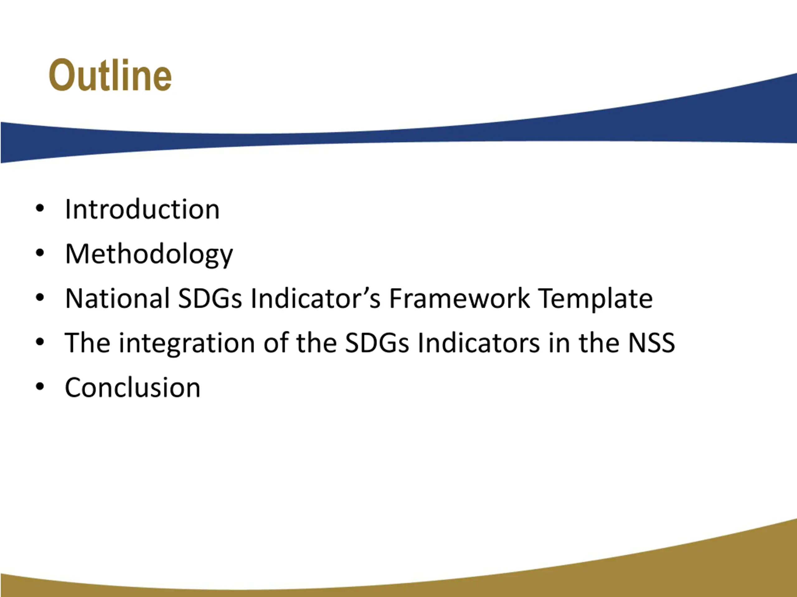 Outline Introduction Methodology National SDGs Indicator s Framework Template The integration of the SDGs Indicators in the NSS Conclusion