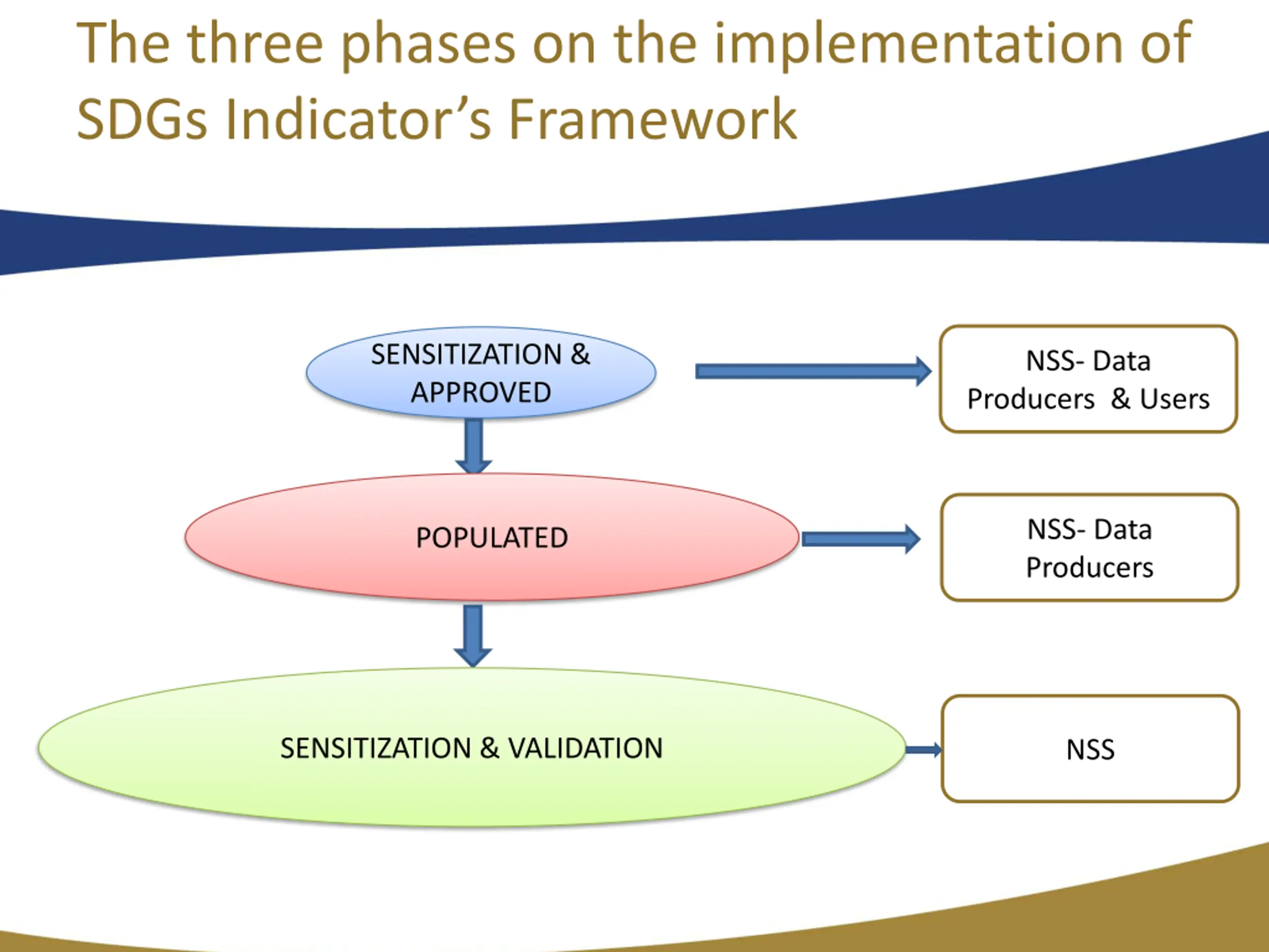 The three phases on the implementation of SDGs Indicator s Framework SENSITIZATION & APPROVED NSS- Data Producers & Users NSS- Data Producers POPULATED SENSITIZATION & VALIDATION NSS