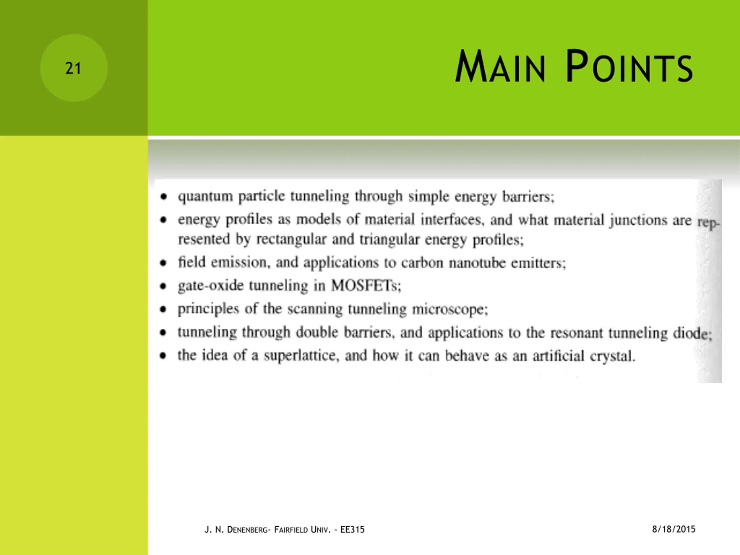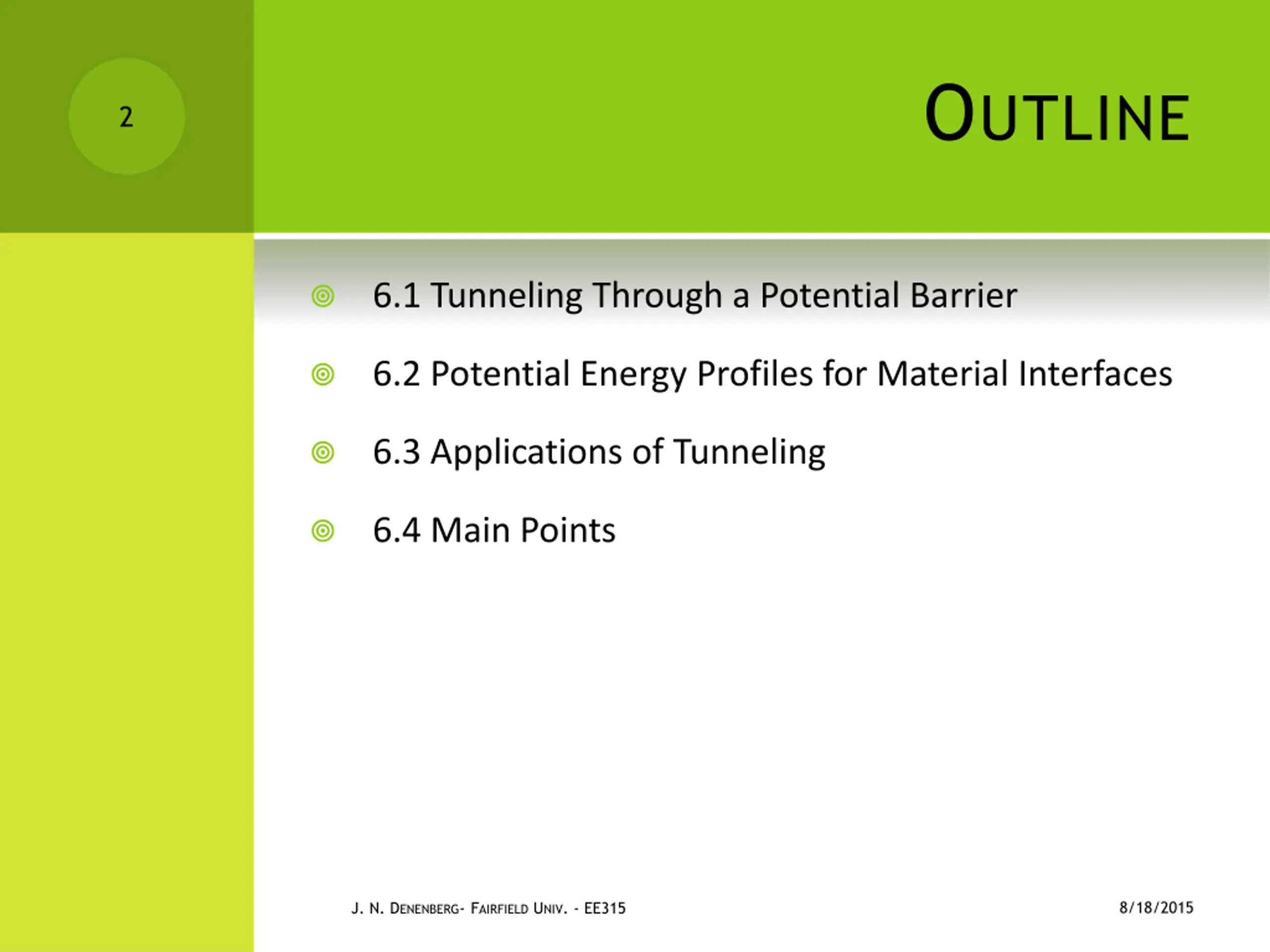 OUTLINE 2 6.1 Tunneling Through a Potential Barrier 6.2 Potential Energy Profiles for Material Interfaces 6.3 Applications of Tunneling 6.4 Main Points 8/18/2015 J. N. DENENBERG- FAIRFIELD UNIV. - EE315