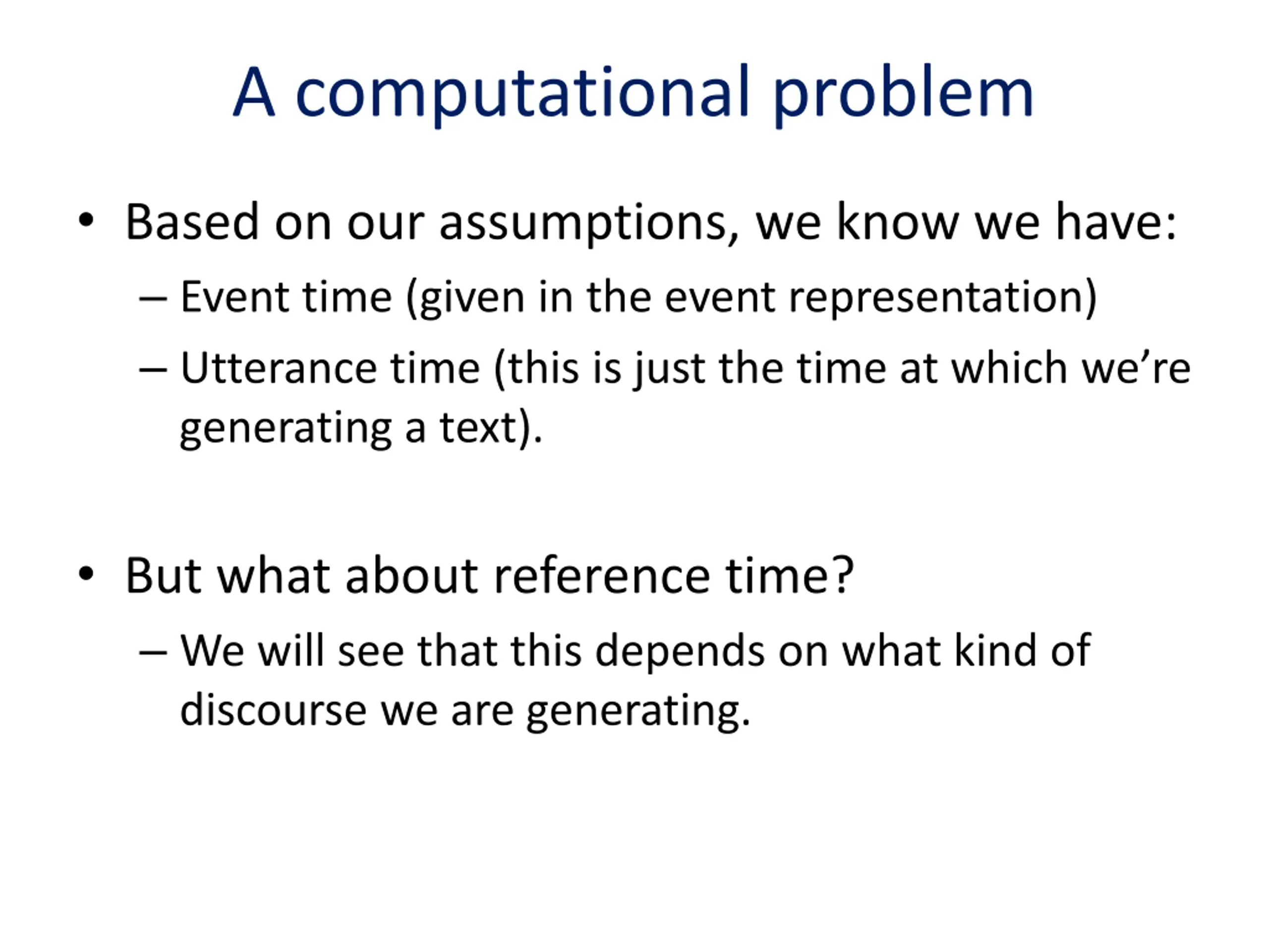 A computational problem Based on our assumptions, we know we have: Event time (given in the event representation) Utterance time (this is just the time at which we re generating a text). But what about reference time? We will see that this depends on what kind of discourse we are generating.