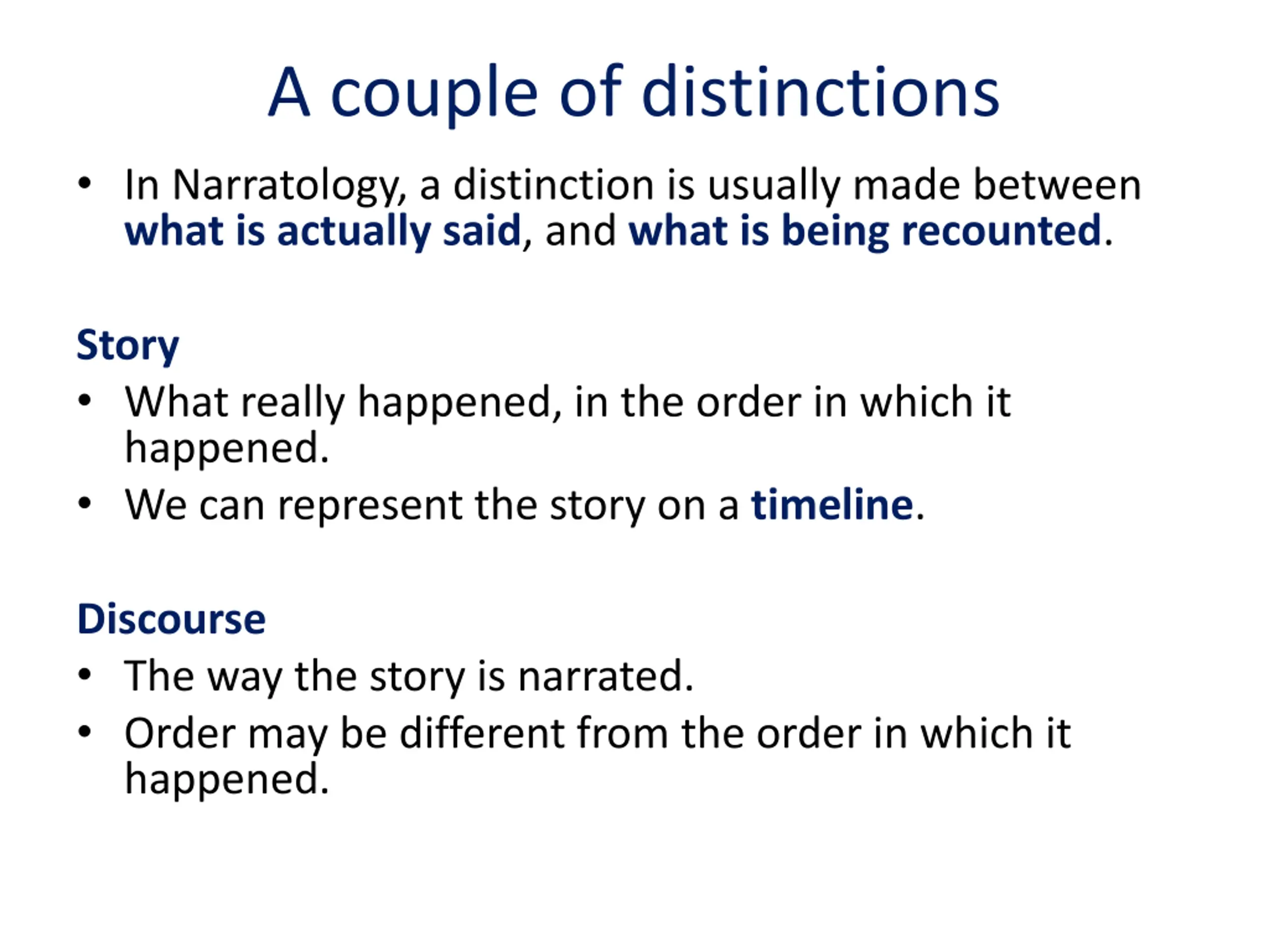 A couple of distinctions In Narratology, a distinction is usually made between what is actually said, and what is being recounted. Story What really happened, in the order in which it happened. We can represent the story on a timeline. Discourse The way the story is narrated. Order may be different from the order in which it happened.