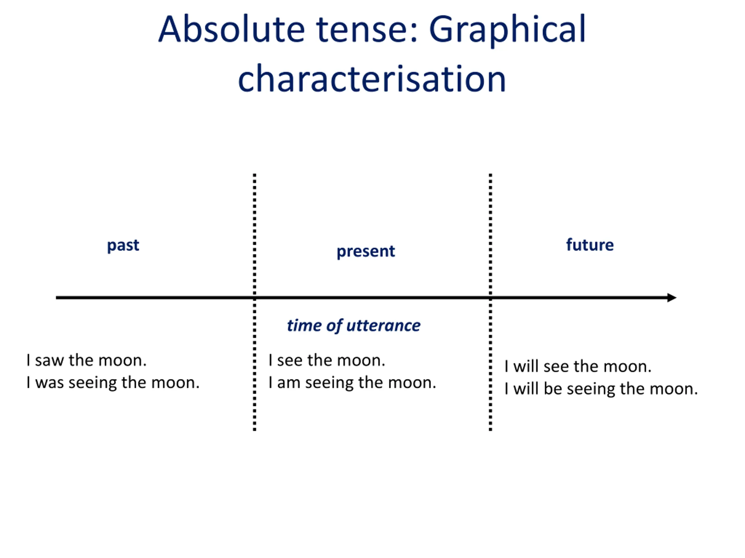 Absolute tense: Graphical characterisation past future present time of utterance I saw the moon. I was seeing the moon. I see the moon. I am seeing the moon. I will see the moon. I will be seeing the moon.