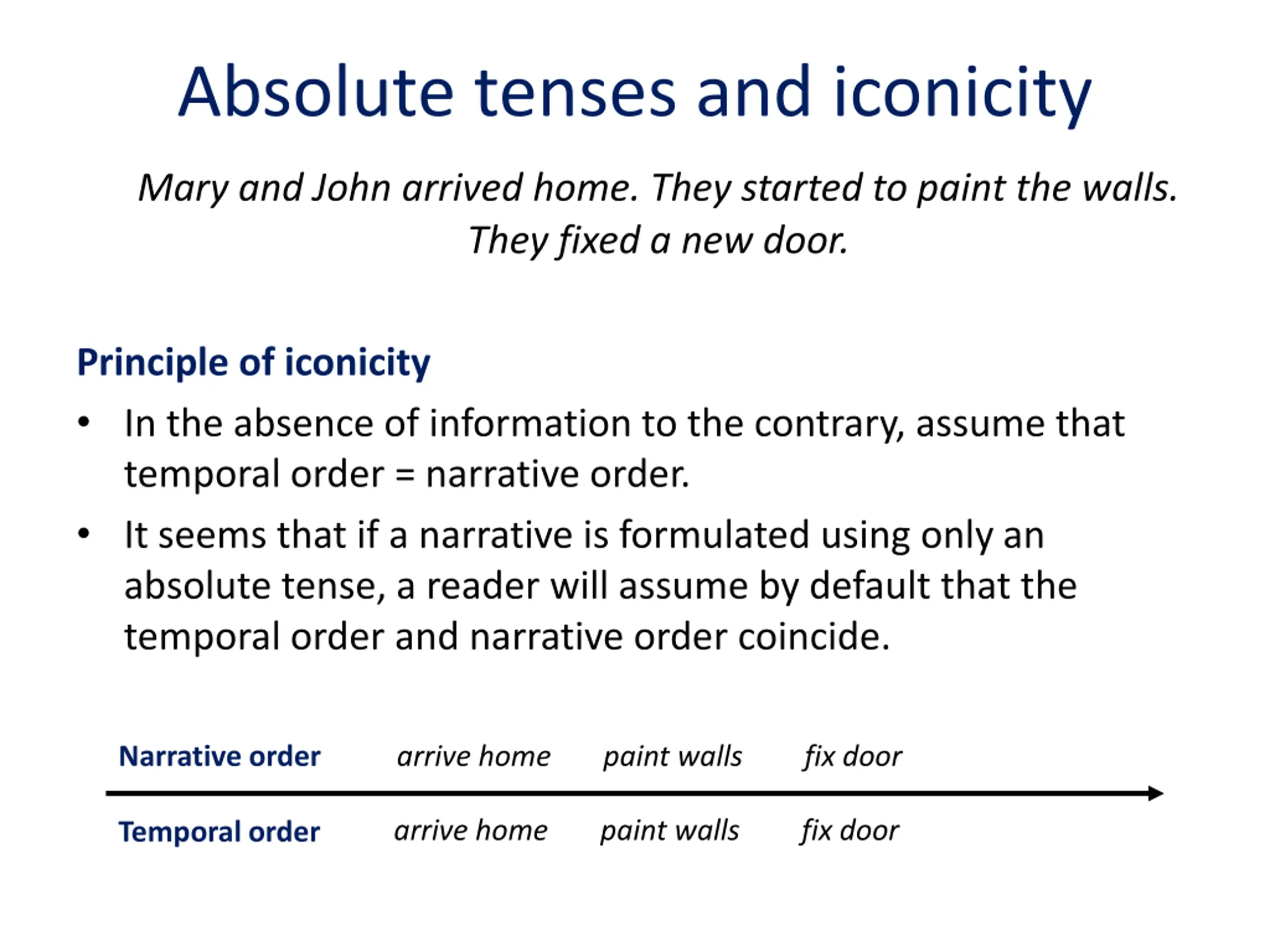 Absolute tenses and iconicity Mary and John arrived home. They started to paint the walls. They fixed a new door. Principle of iconicity In the absence of information to the contrary, assume that temporal order = narrative order. It seems that if a narrative is formulated using only an absolute tense, a reader will assume by default that the temporal order and narrative order coincide. Narrative order arrive home paint walls fix door arrive home paint walls fix door Temporal order